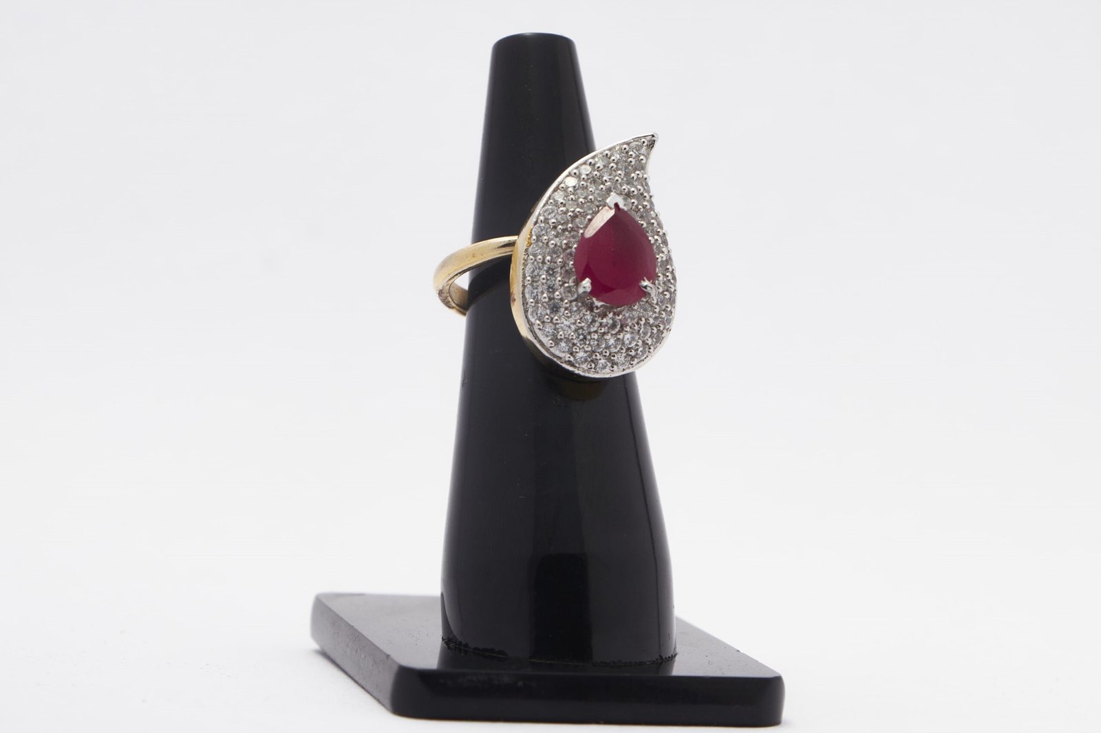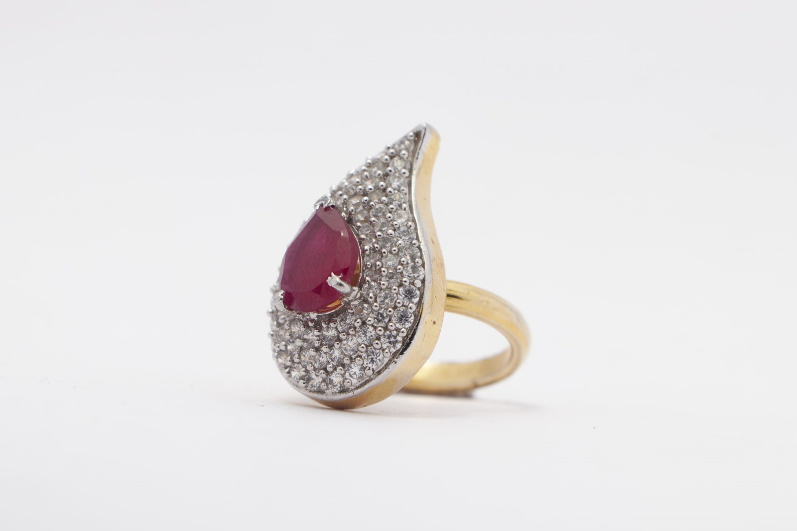 This charming ring has semi precious ruby coloured stone and fine zirconia.it has gold finish and a lovely gift for your loved one.it is adjustable too!!