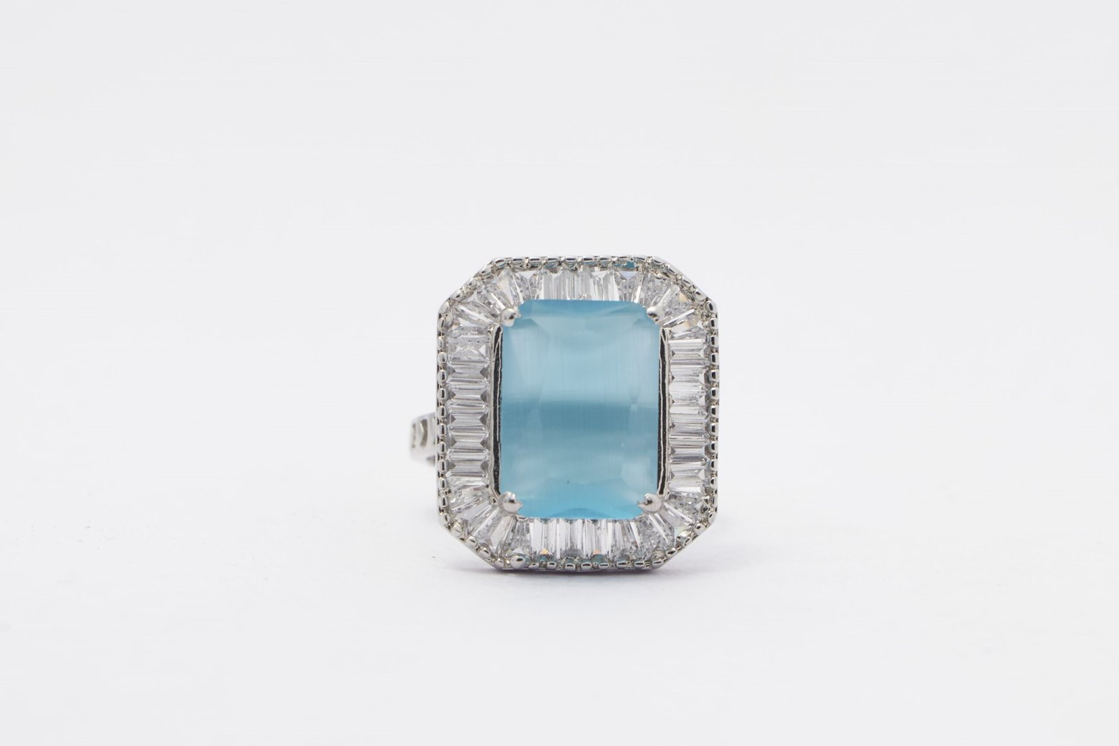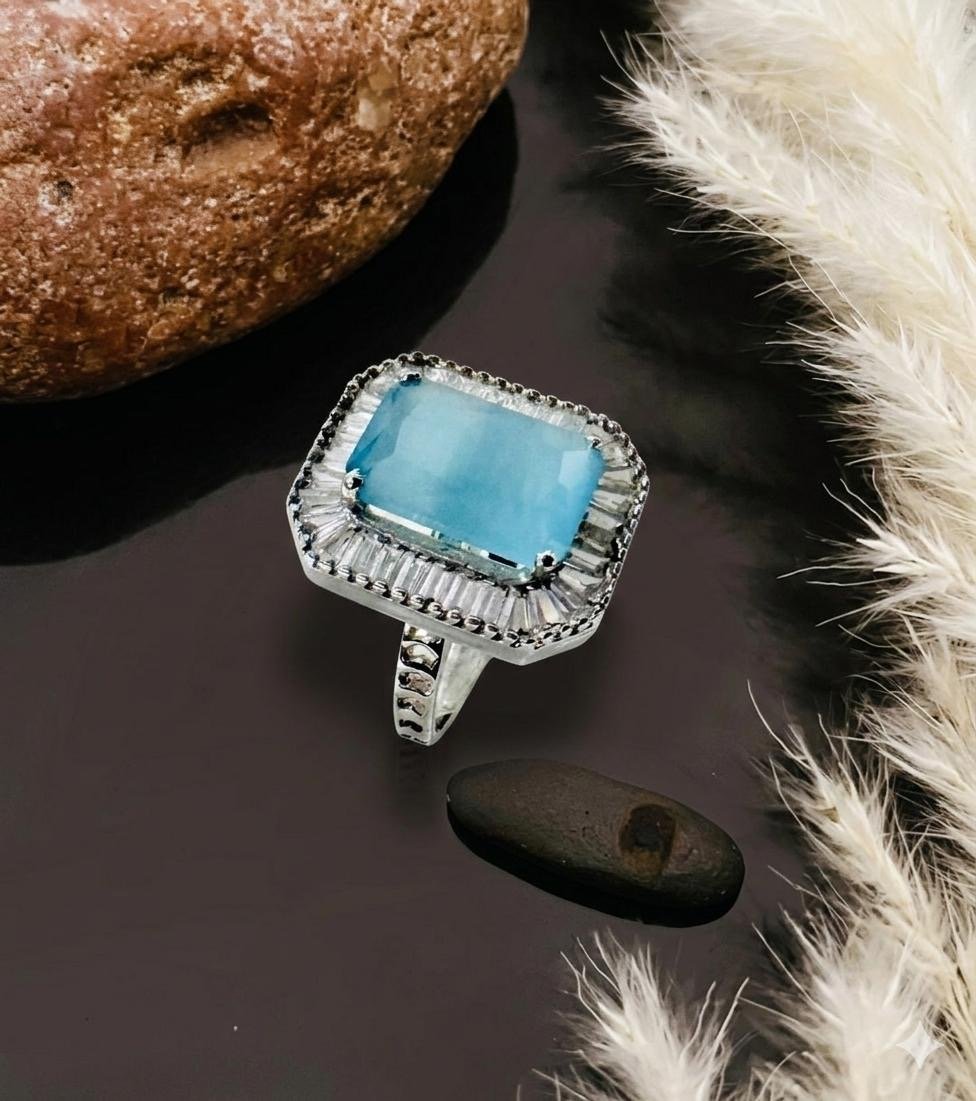 This chic ring has intricate setting of zirconia and bold blue semi precious stone.it has rhodium finish.it is actually very sassy! It is perfect for all age groups.it is skin friendly.team it up with whichever dress- indian or western.