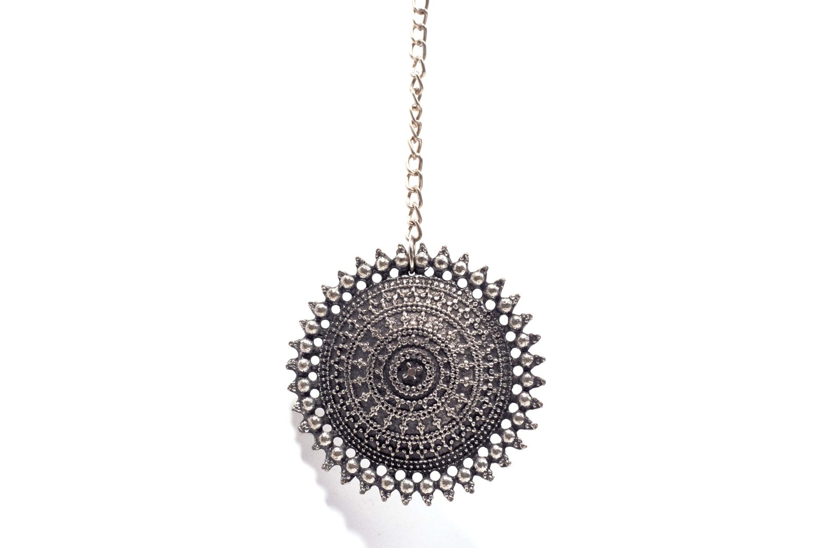 This unique maang tika showcases a beautifully detailed antique silver finish with a captivating sunburst design. The intricate patterns and textured surface give it a vintage charm, making it a standout accessory for traditional and bohemian ensembles alike. The circular pendant is connected to a sturdy silver chain, ensuring it stays securely in place. Ideal for festive occasions to add a touch of elegance to your look. this maang tika is perfect for those who appreciate timeless 1st craftsmanship.