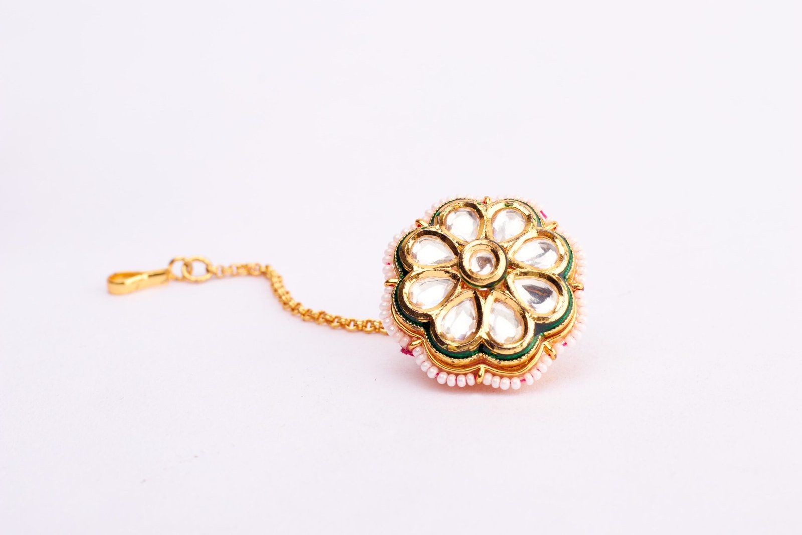 At its forefront, delicate droplet-shaped stones converge in an enchanting floral arrangement, culminating in a captivating round stone at the heart of the design. The side walls of the borla are adorned with petite pearls, adding a touch of timeless elegance.