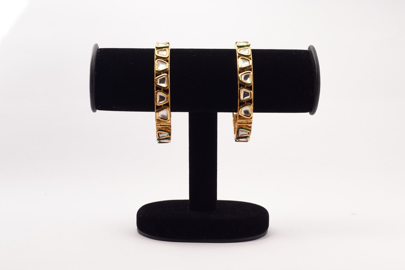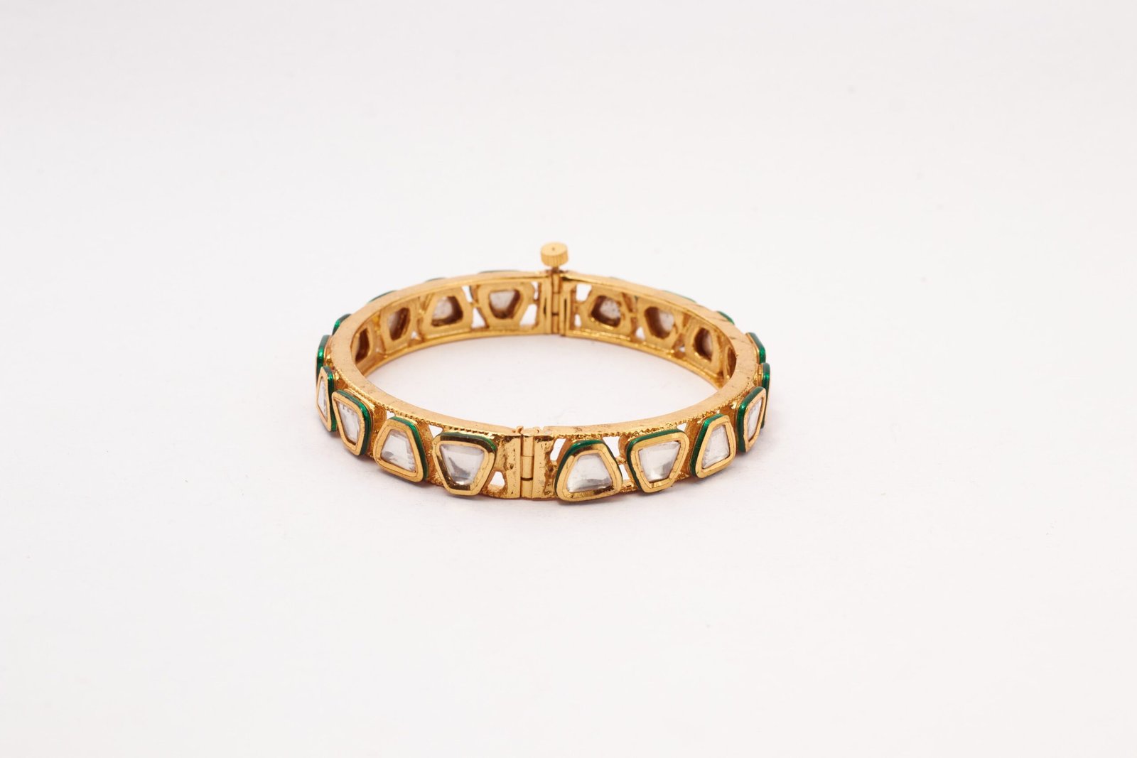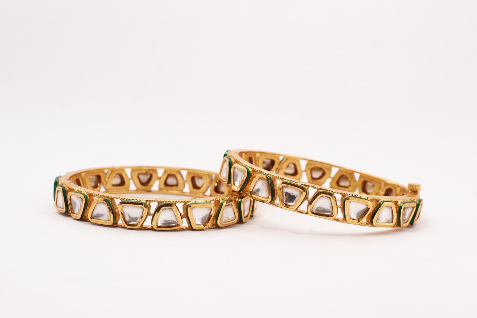 This priceless and gracious triangular cut kundan bangles reflects imperial look. It has golden finish and openable pattern. It has an alloy and anti tarnish too. It looks amazing with all kinds of traditional attires. It is skin friendly.