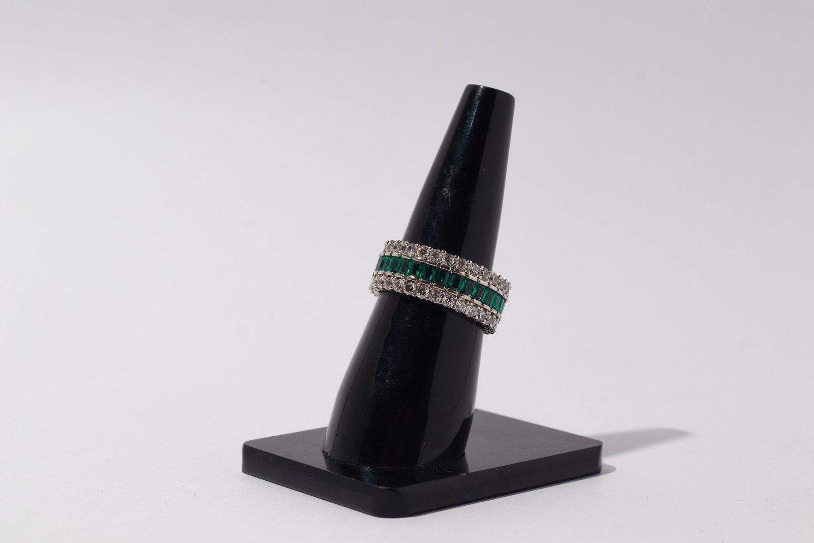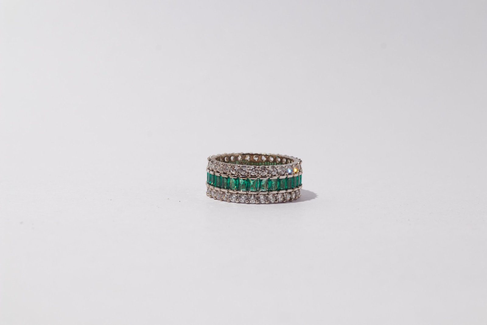 Introducing our Blushing Green Emerald Ring, a stunning testament to grace and sophistication. Crafted from 925 sterling silver with a radiant rhodium finish, this ring showcases a captivating baguette-shaped at its center, surrounded by glittering Green Emerald gemstones. The beguiling blue sapphire exudes a cool, azure charm that perfectly complements the lustrous silver setting. The gemstones add a touch of sparkle and brilliance to this masterpiece, creating a harmonious blend of color and shine.