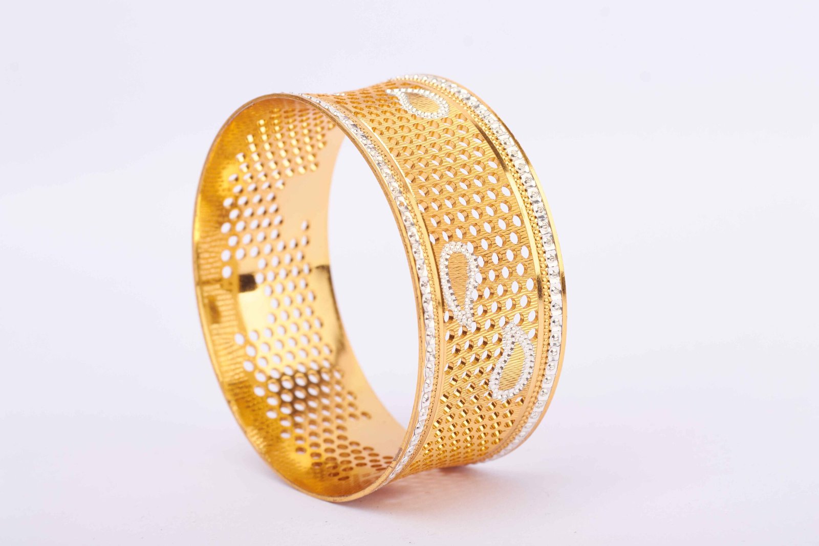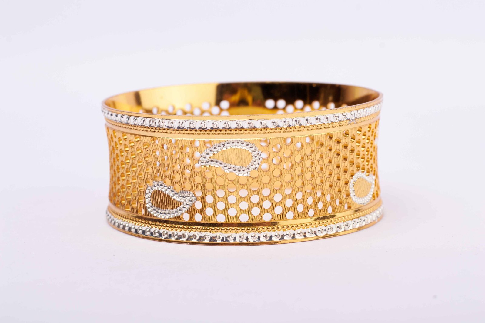 The bracelet cum kada is a masterpiece of craftsmanship, blending the traditional charm of a kada with contemporary design elements. The circle shape grille design adds a touch of celestial beauty, while the unique shapes incorporated into the design create an intriguing visual appeal.