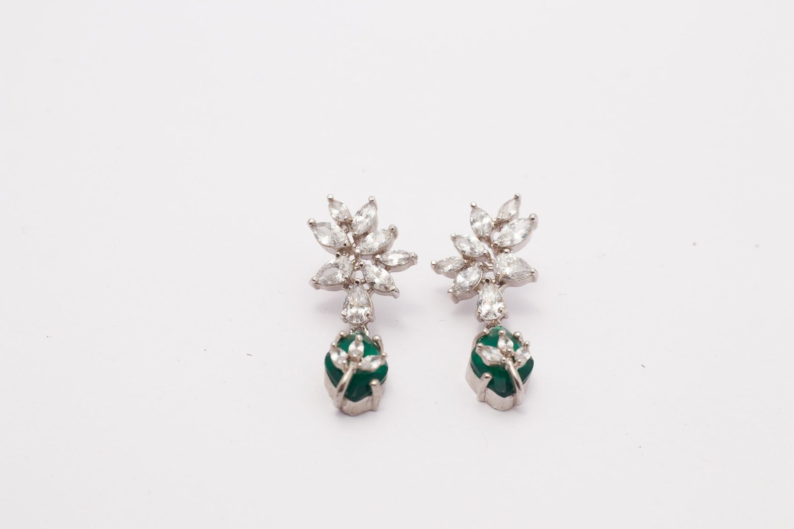 This alluring and sparkling pair of earrings cater to the need of unique and contemporary jewelry. It has high class zirconia and semi precious green stone. It is very artistically designed and has rhodium finish. It goes very well with almost all kinds of attires. It is light in weight and skin friendly too!