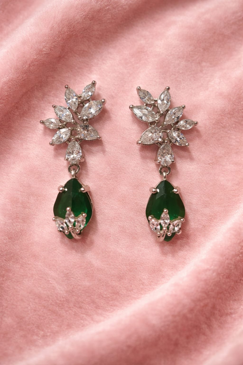 This alluring and sparkling pair of earrings cater to the need of unique and contemporary jewelry. It has high class zirconia and semi precious green stone. It is very artistically designed and has rhodium finish. It goes very well with almost all kinds of attires. It is light in weight and skin friendly too!
