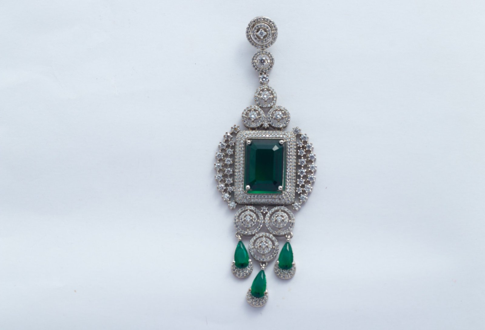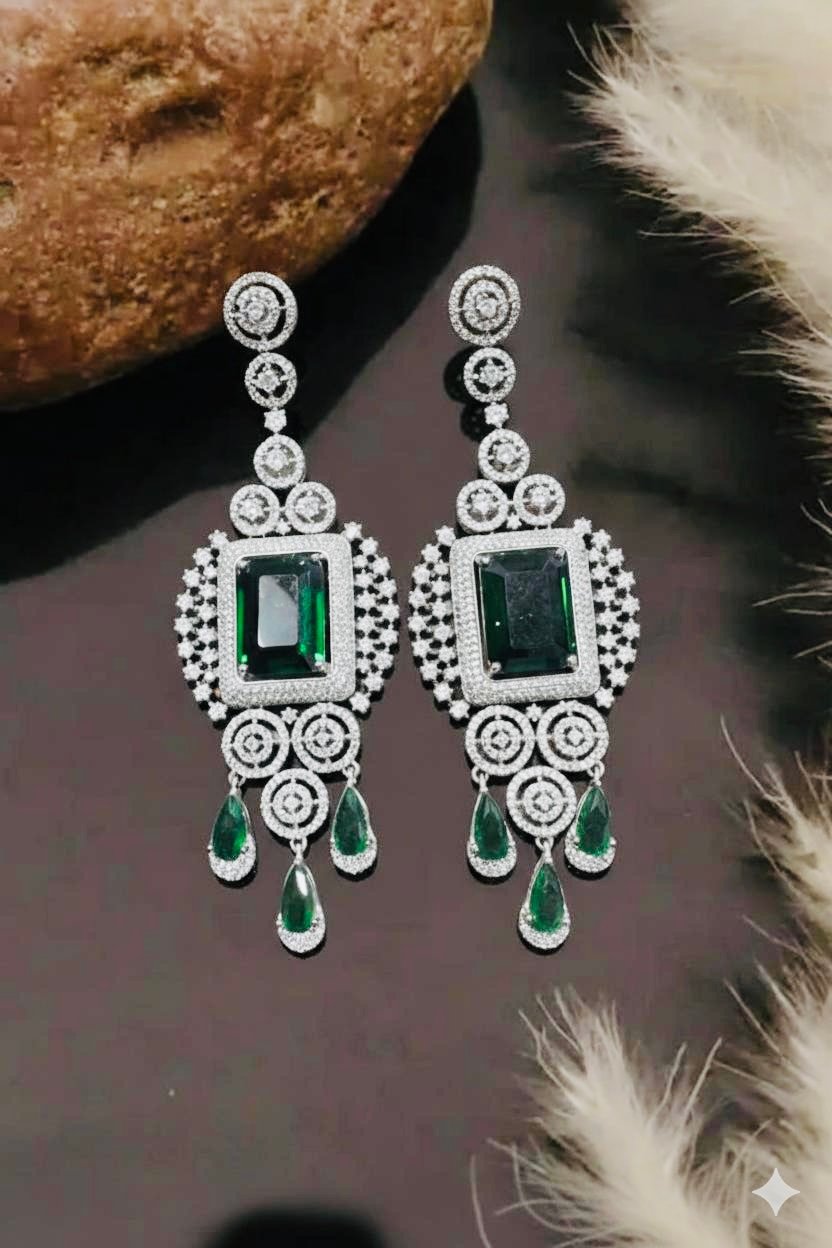Introducing our “Emerald Zirconia Earrings,” a harmonious blend of classic and modern design. These exquisite earrings are meticulously crafted to enhance your style and captivate hearts.Each earring is adorned with a lustrous silver finish that exudes sophistication. At the heart of the design, a captivating square-shaped green stone takes center stage, reminiscent of a precious emerald. The square stone is encircled by a halo of shimmering zirconia stones that add a touch of brilliance.
