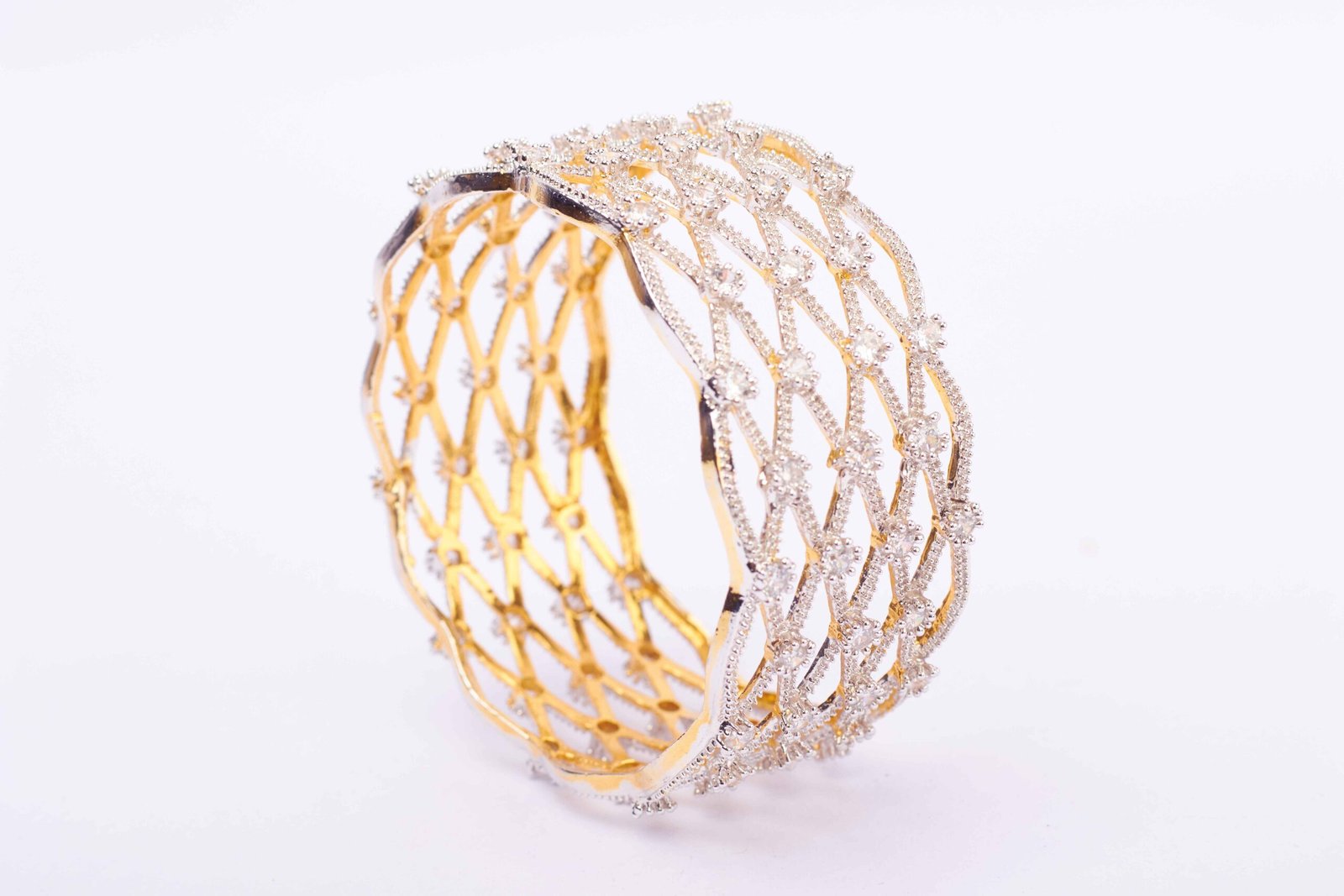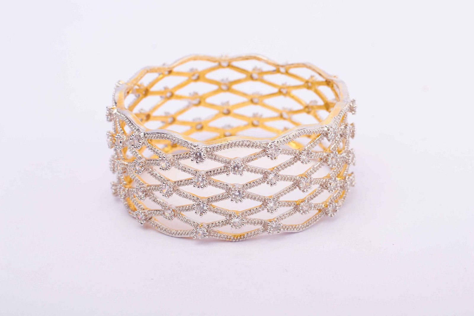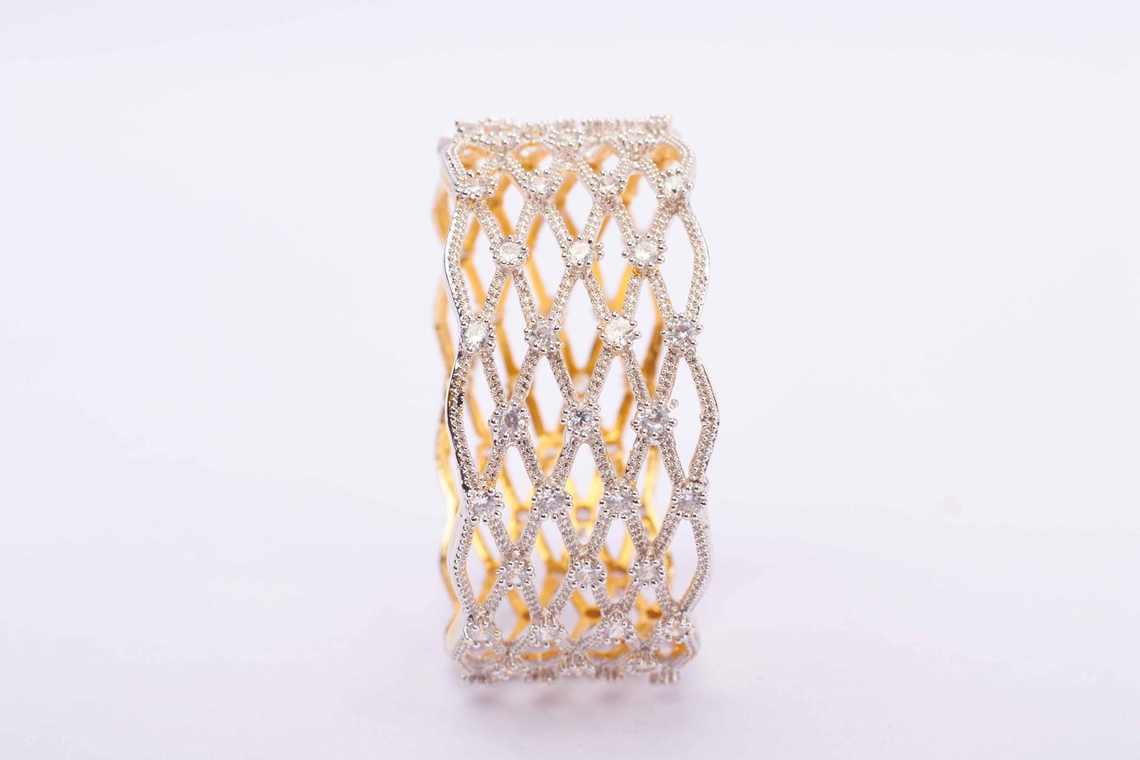 The bracelet is a harmonious blend of modern design and timeless elegance. The criss-cross pattern, meticulously crafted, adds a contemporary touch, while the embedded zirconia stones infuse a celestial sparkle into the overall design.