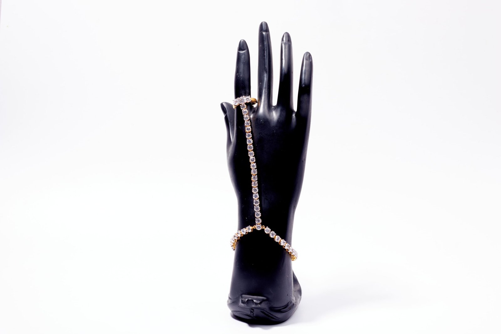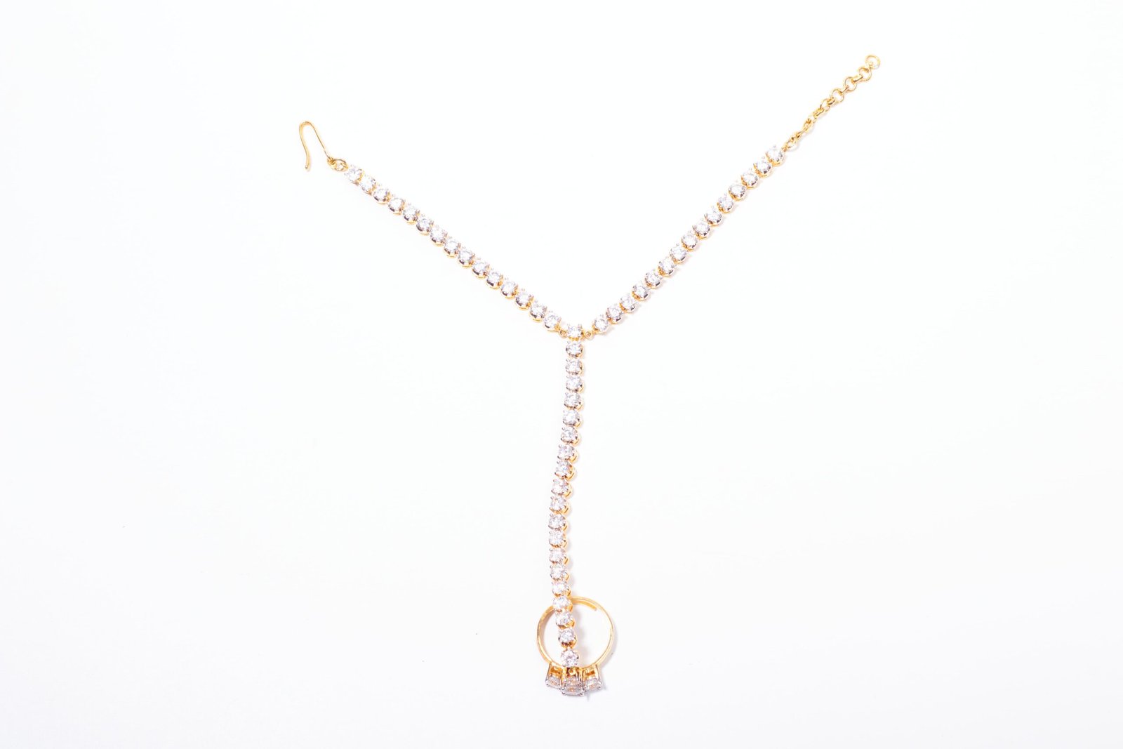 Embrace the epitome of elegance with the Crystal Cascade Hand Harness. This exquisite piece showcases a sleek gold finish, meticulously polished for a radiant shine. The design is a perfect blend of simplicity and sophistication, featuring a single strand of dazzling clear stones that seamlessly connects the ring to the bracelet. The ring and bracelet are adorned with the same sparkling clear stones, creating a harmonious and cohesive look. Ideal for weddings, formal events, and special occasions, the Crystal Cascade Hand Harness adds a touch of refined glamour to any ensemble. Experience the timeless allure of understated luxury with this stunning accessory.