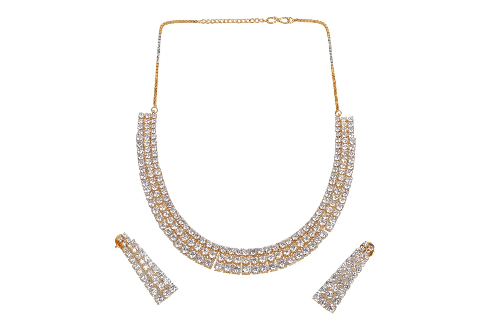 Shine bright with our Dazzling Elegance Necklace Set. This stunning set features a beautifully crafted necklace adorned with rows of sparkling cubic zirconia stones, creating a radiant and luxurious look. The necklace is paired with matching statement earrings, each designed to reflect the same dazzling brilliance. The gold-toned chain adds a touch of warmth and sophistication, making this set perfect for glamorous evenings and special occasions. Elevate your ensemble with the timeless sparkle and elegance of the Dazzling Elegance Necklace Set.