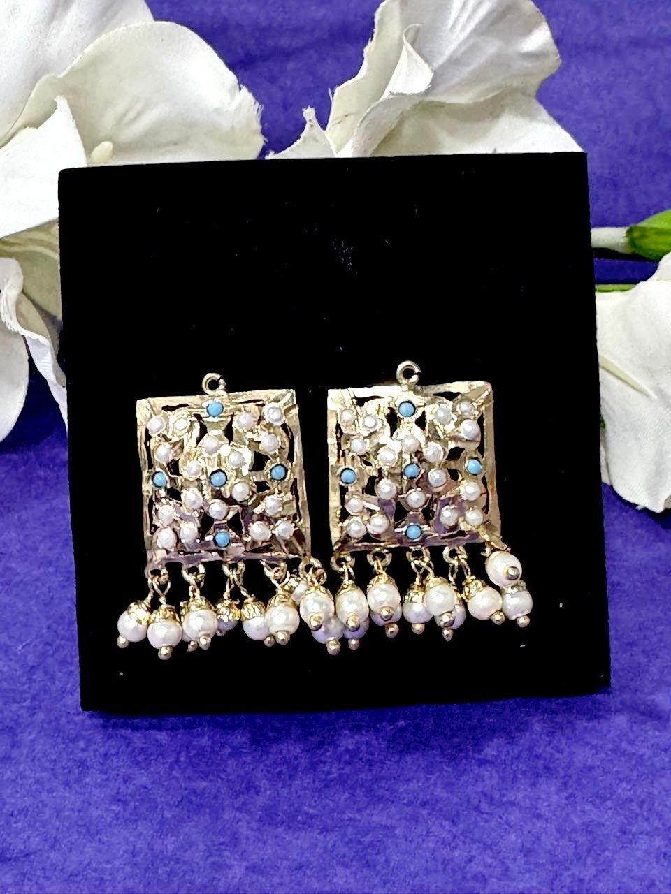 Add a touch of sophistication to your look with these exquisite gold plated earrings. Featuring in intricate floral designs accented with Turquoise stones and delicate Pearl drops these earrings are perfect for traditional and contemporary outfit. lightweight and comfortable to wear, they are an ideal accessory for weddings, parties, or festive occasions. crafted with precision they ensure durability and timeless elegance.