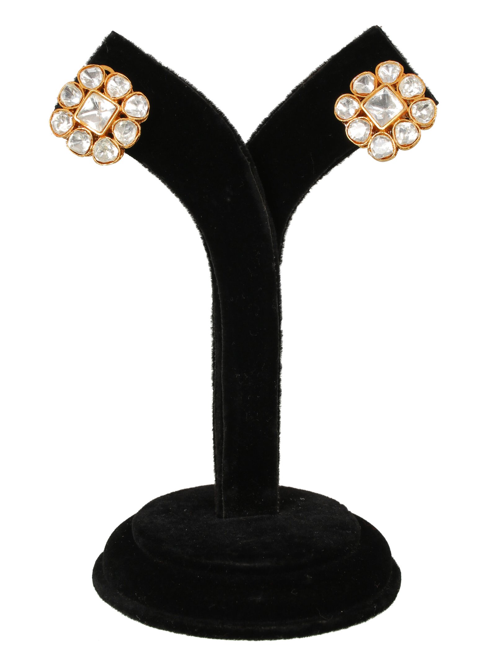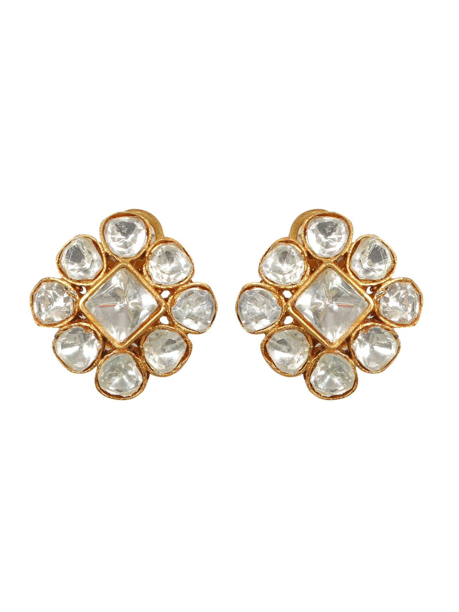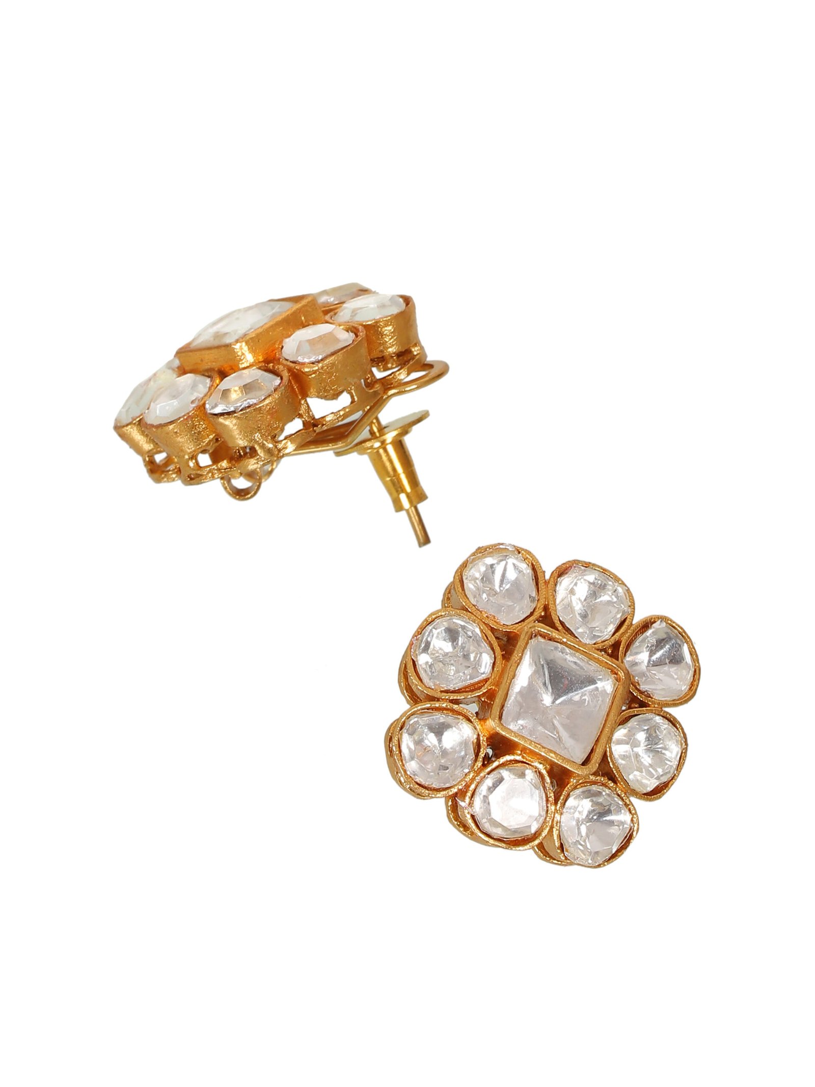 These handcrafted kundan studs earring feature a classic floral design, showcasing shimmering glass stones meticulously set in a gold tone base perfect for traditional or festive occasion these earrings add to touch of timeless elegance to any outfit lightweight and comfortable They are an ideal choice for all day wear.