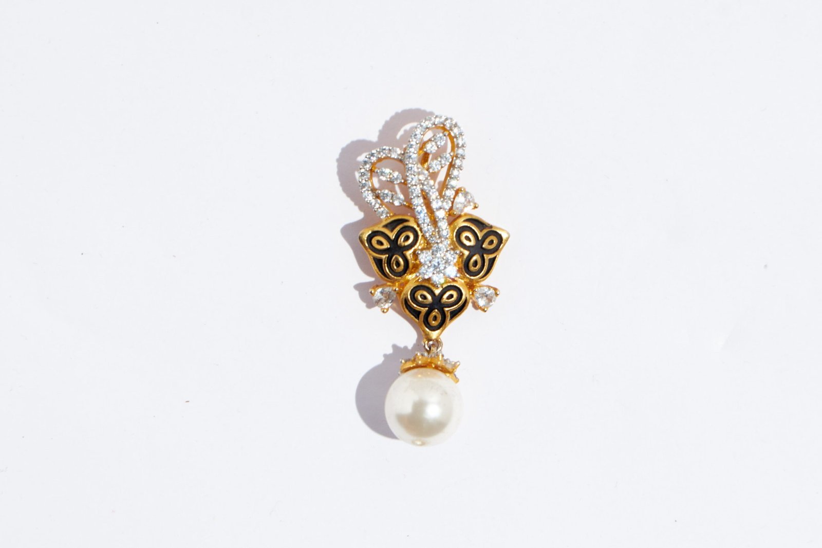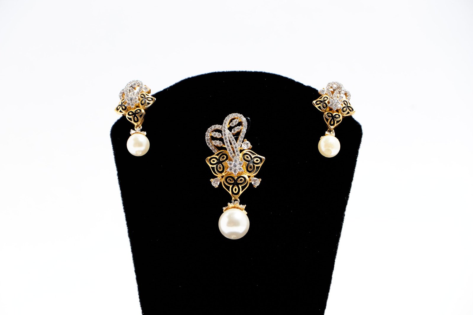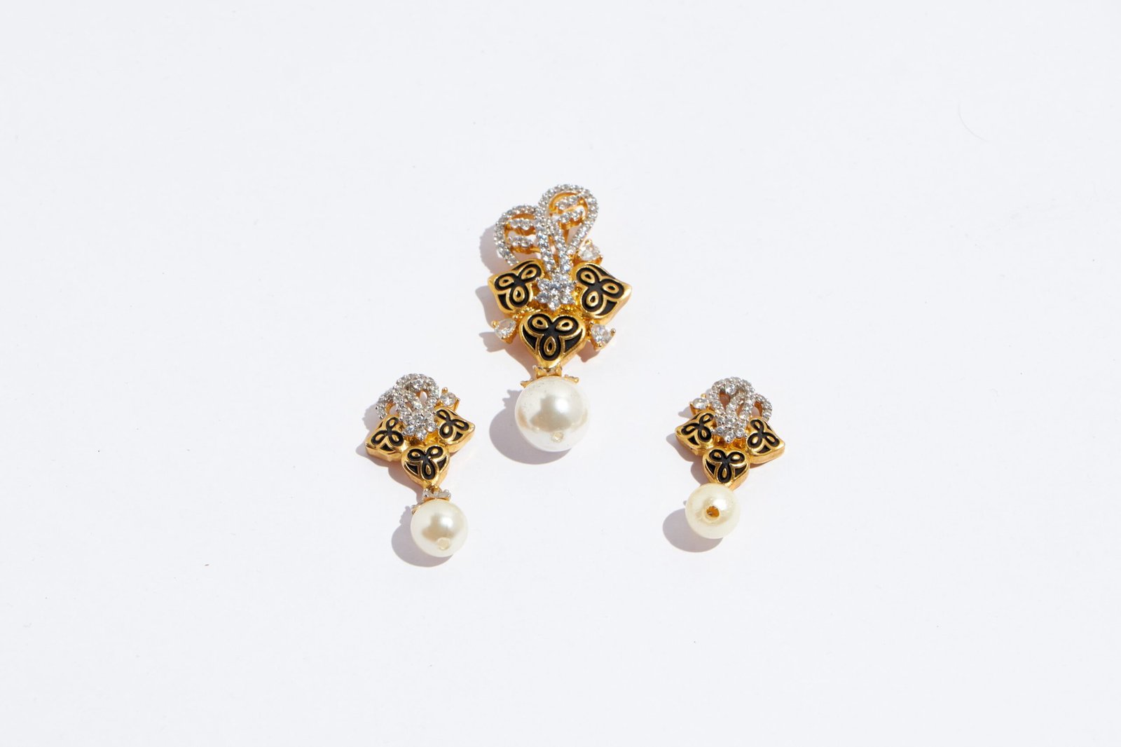 The pendant set features a beautiful golden finish that is perfectly complemented by the shimmering zirconia and a stunning pearl drop. The unique design of the pendant set showcases a creative and intricate combination of natural and modern elements, highlighting the beauty of both. The pearl drop adds a touch of elegance and refinement to the design, while the glimmering zirconia provide a touch of modern sophistication. It exudes fantastic fusion.