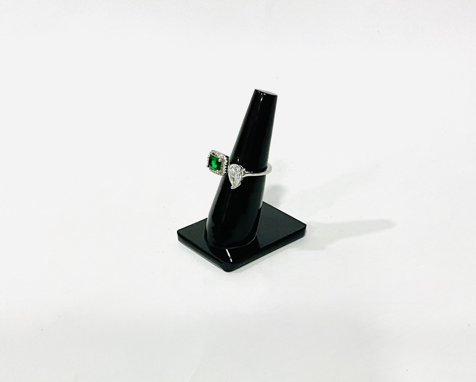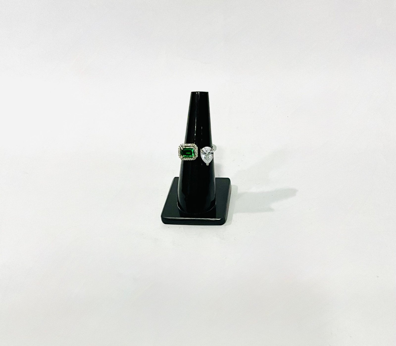 Make a bold statement with this elegant open band ring featuring a striking combination of two centerpiece stones. On one side, a radiant emerald-cut green stone framed with shimmering crystals adds a regal charm, while on the other, a brilliant round-cut crystal offers classic sparkle. Set in a sleek silver-tone adjustable band, this ring beautifully balances luxury and contemporary design, perfect for evening wear or elevating everyday outfits.