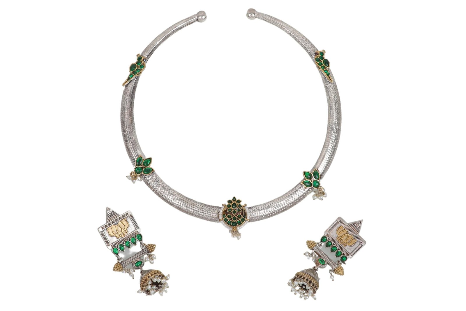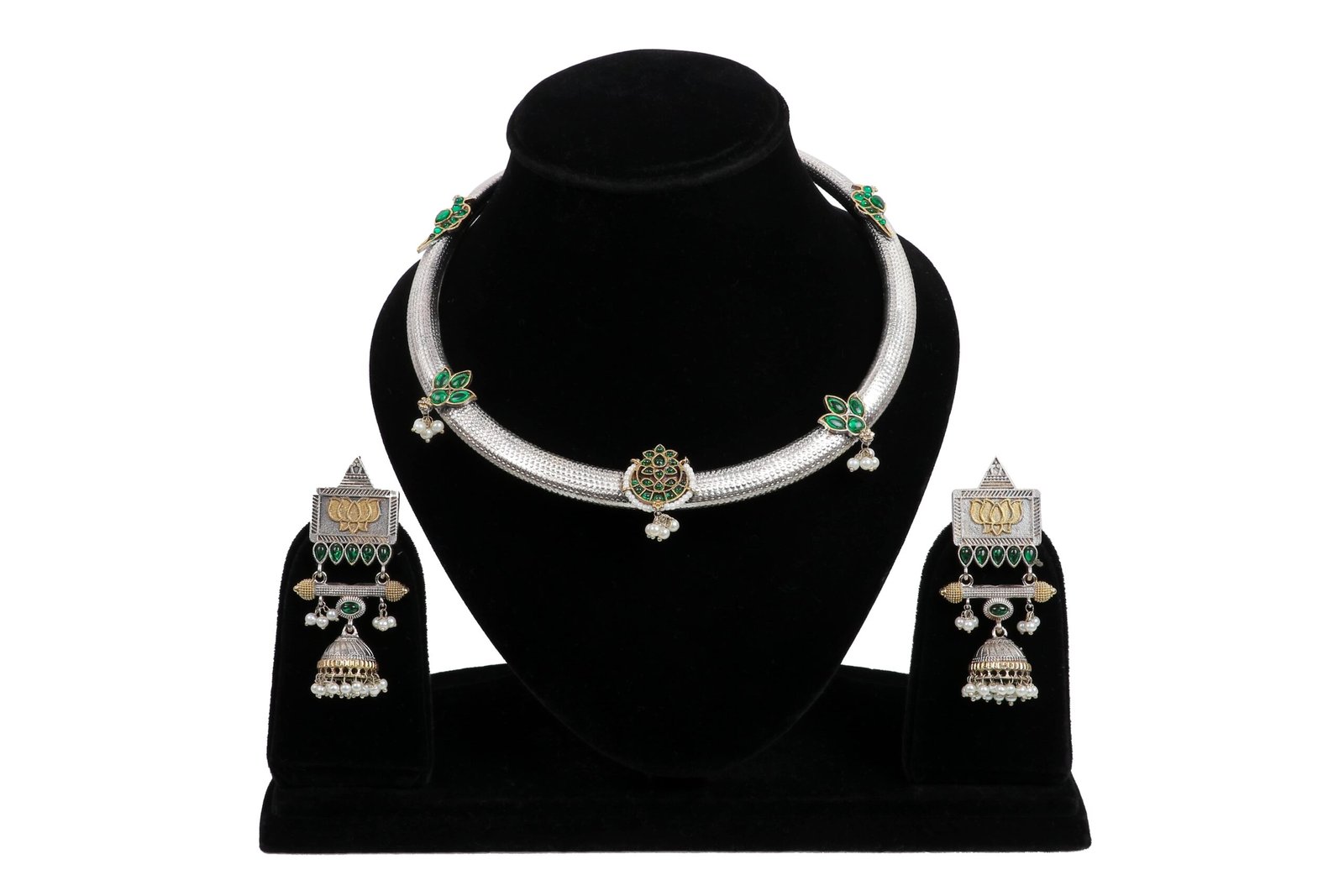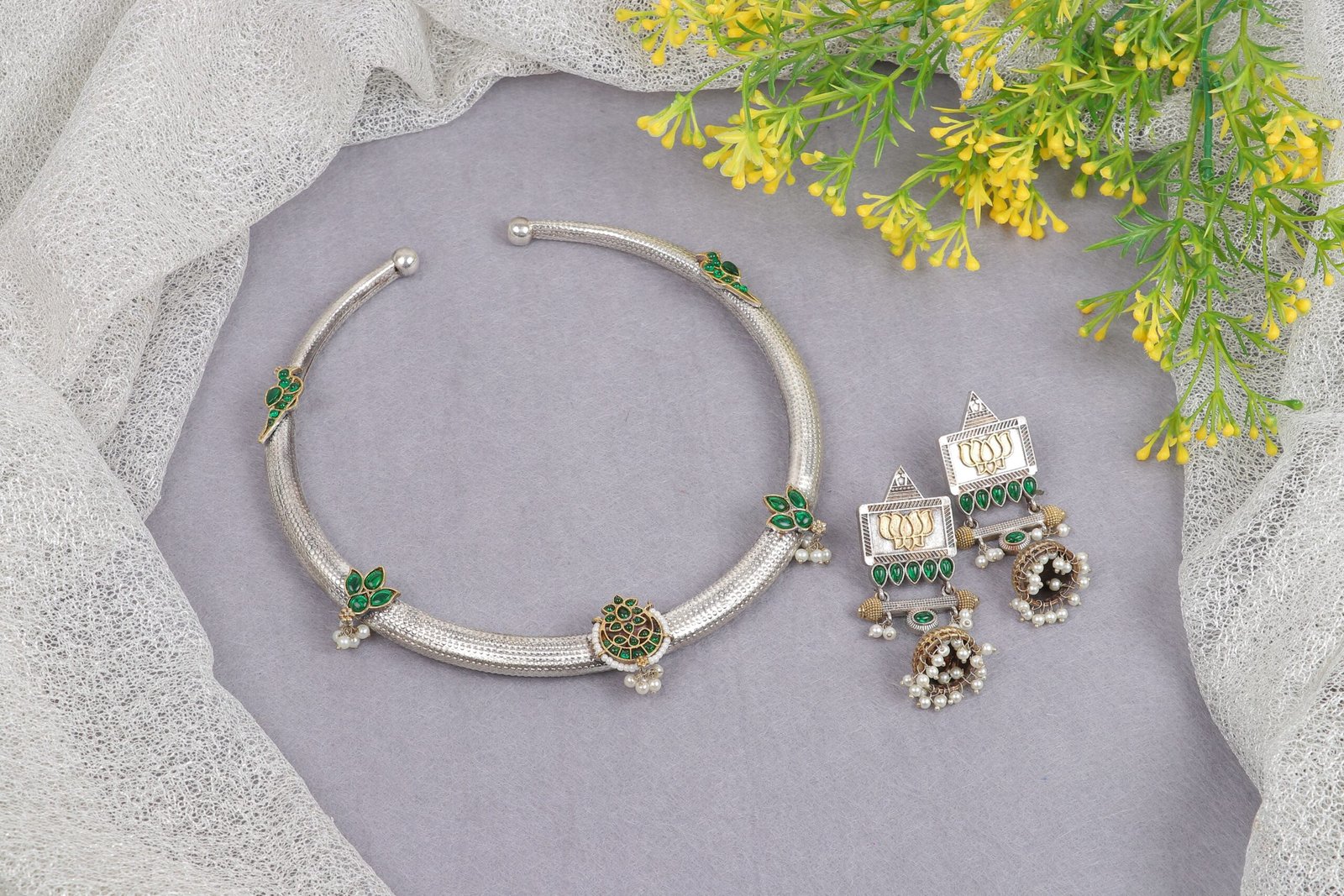 Embrace timeless sophistication with our Emerald Elegance German Silver Neckset. This stunning piece features a meticulously crafted choker with an exquisite German silver finish, adorned with intricate green stone floral motifs that exude elegance. The matching earrings mirror the design, showcasing a harmonious blend of traditional artistry and modern style. Perfect for special occasions or to elevate your everyday look, this neckset is a testament to superior craftsmanship and refined taste. Make a statement with this elegant ensemble, designed to enhance your natural beauty and grace.