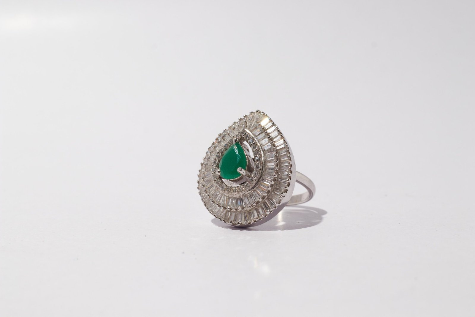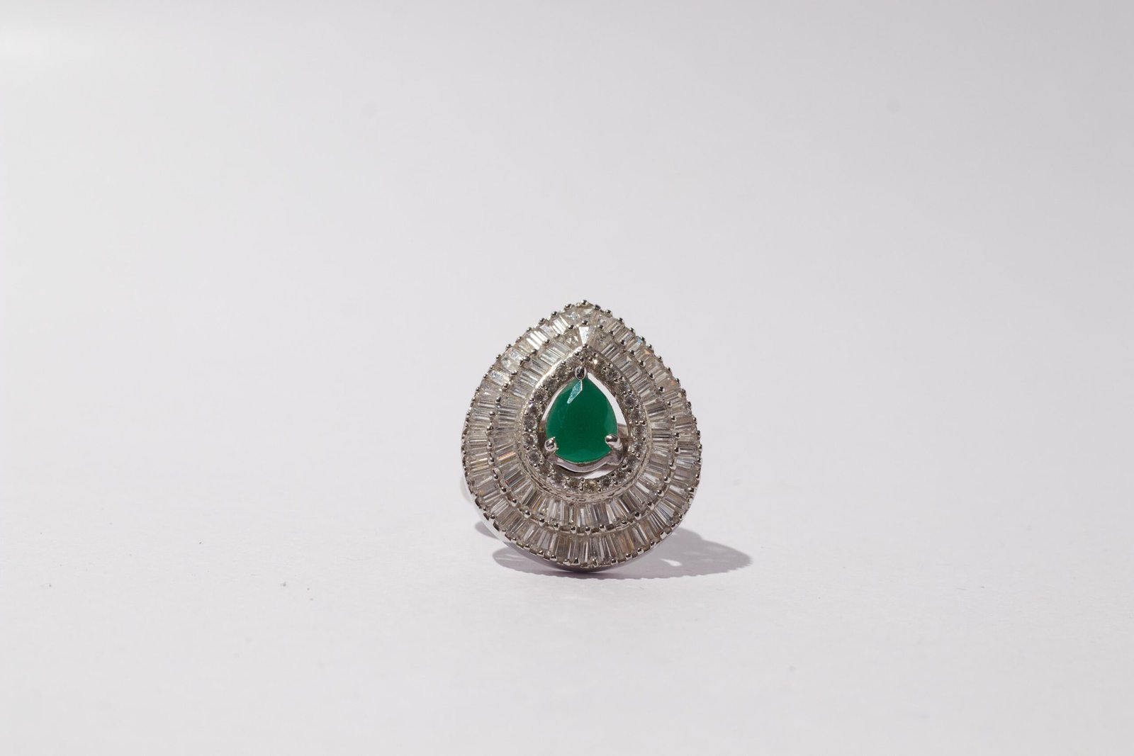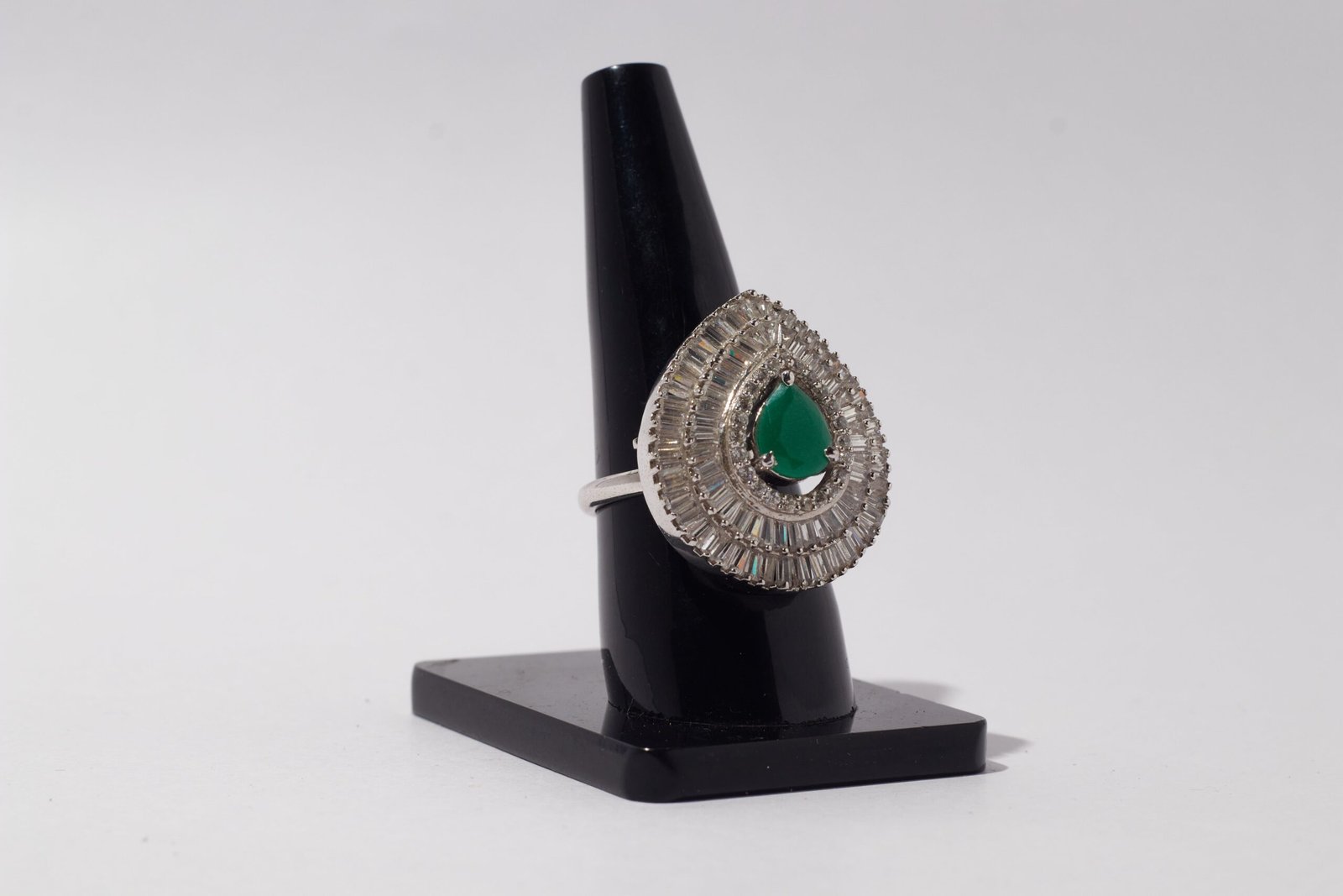 Elevate your style with the “Emerald Radiance Elegance Ring,” a captivating piece that marries the lush beauty of a pear-shaped green stone with the timeless sparkle of surrounding zirconia stones, all embraced by a sleek silver finish. The focal point of this ring is the stunning pear-shaped green stone at its center, capturing the essence of natural elegance. Surrounding it are meticulously placed zirconia stones, creating a brilliant halo that enhances the vibrancy of the green centerpiece. The silver finish of the ring adds a touch of sophistication, providing a cool and versatile backdrop to the radiant gemstones. Whether worn as a standalone statement or paired with other accessories, the “Emerald Radiance Elegance Ring” is a symbol of refined taste and enduring beauty. Elevate your jewelry collection with the allure of the “Emerald Radiance Elegance Ring” and let your fingers sparkle with the timeless beauty of green and silver.