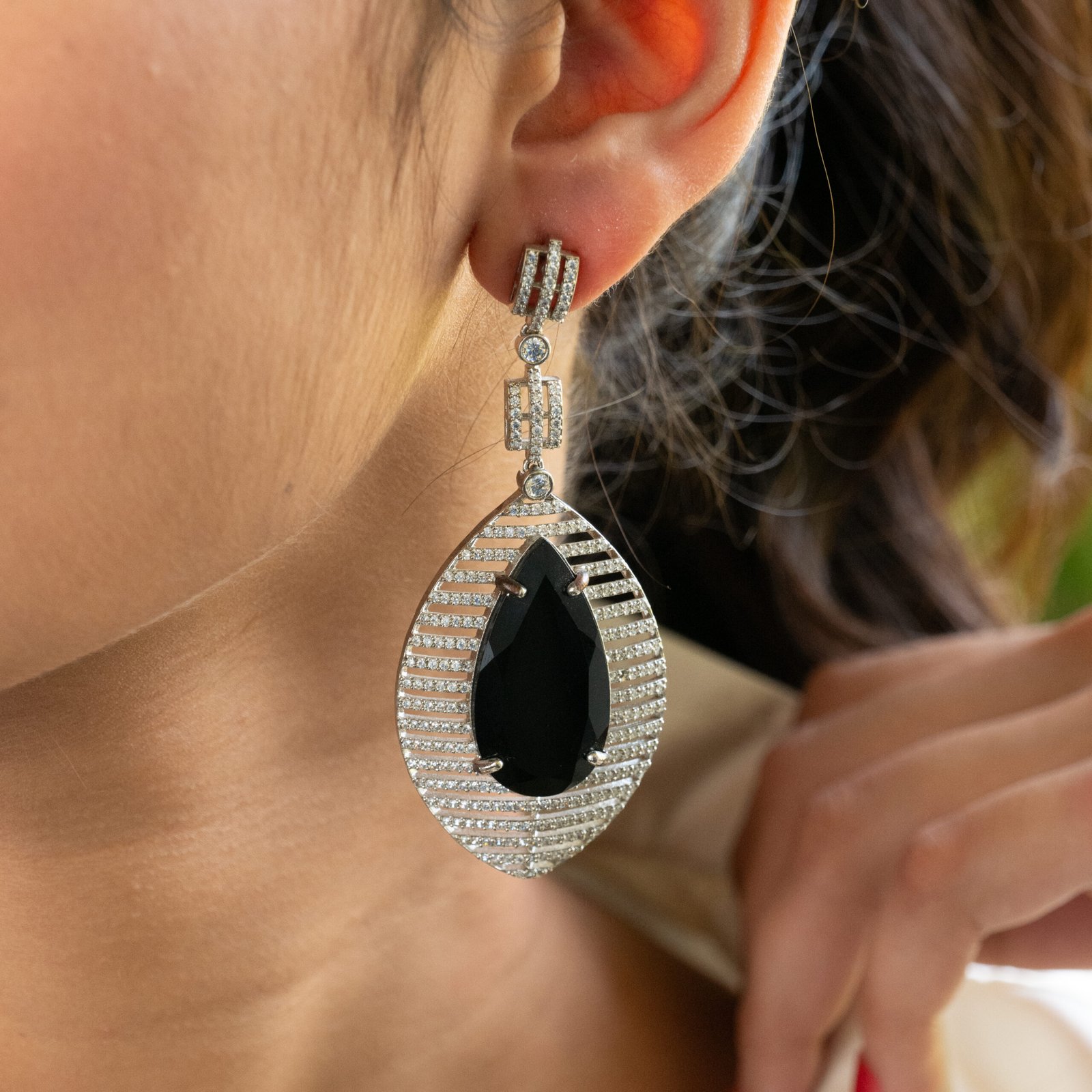 Introducing our “Ebony Elegance Zirconia Earrings,” a fusion of innovative design and timeless sophistication. These exquisite earrings are meticulously crafted to elevate your style and captivate attention.The unique design of each earring features a central droplet-shaped black stone, adding depth and intrigue to the composition. Surrounding the black stone are numerous shimmering zirconia stones, creating a dazzling effect that illuminates your beauty.The silver finish adds a touch of elegance and versatility to the design, making these earrings suitable for any occasion.