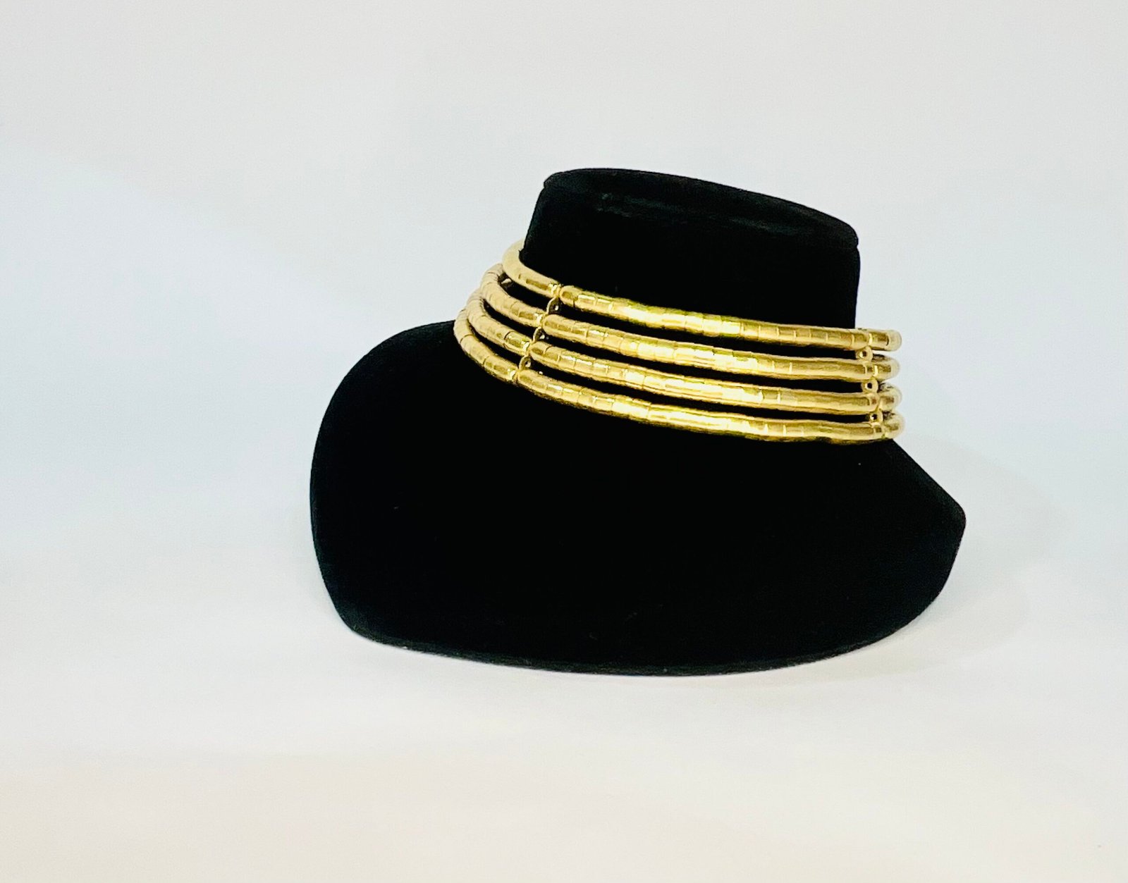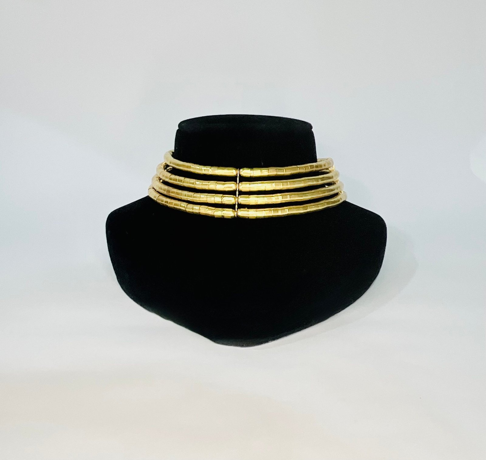 Elevate your elegance with this bold and luxurious funky choker necklace, featuring four structured, tubular bands joined at the center for a statement look. Inspired by traditional regal neckpieces, this choker blends timeless charm with modern minimalism. Perfect for weddings, festive occasions, or high-fashion styling, it sits gracefully on the neck, adding a touch of opulence to any outfit. Crafted for durability and shine, it ensures you stand out with confidence and grace.
