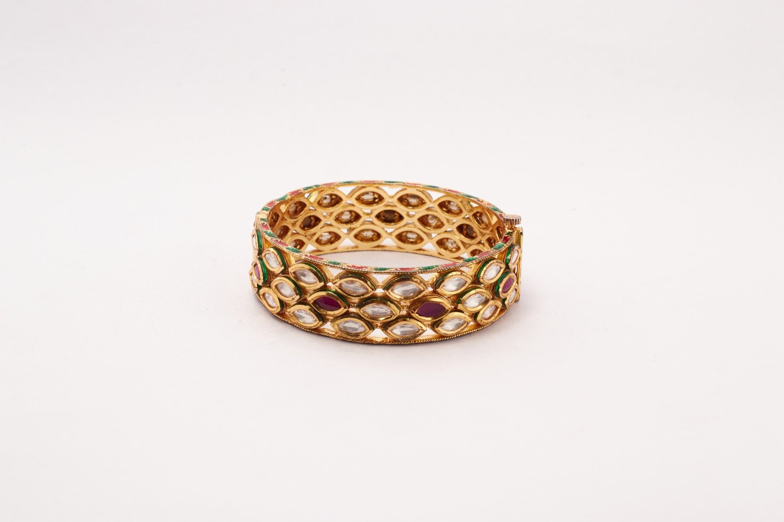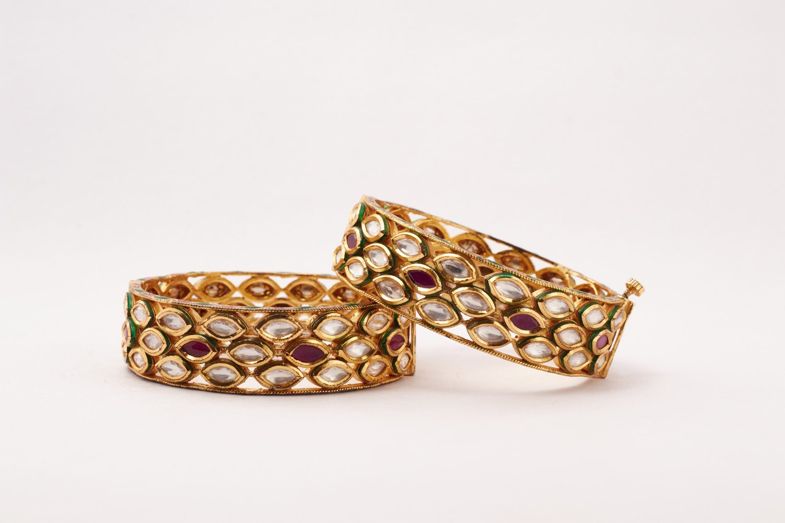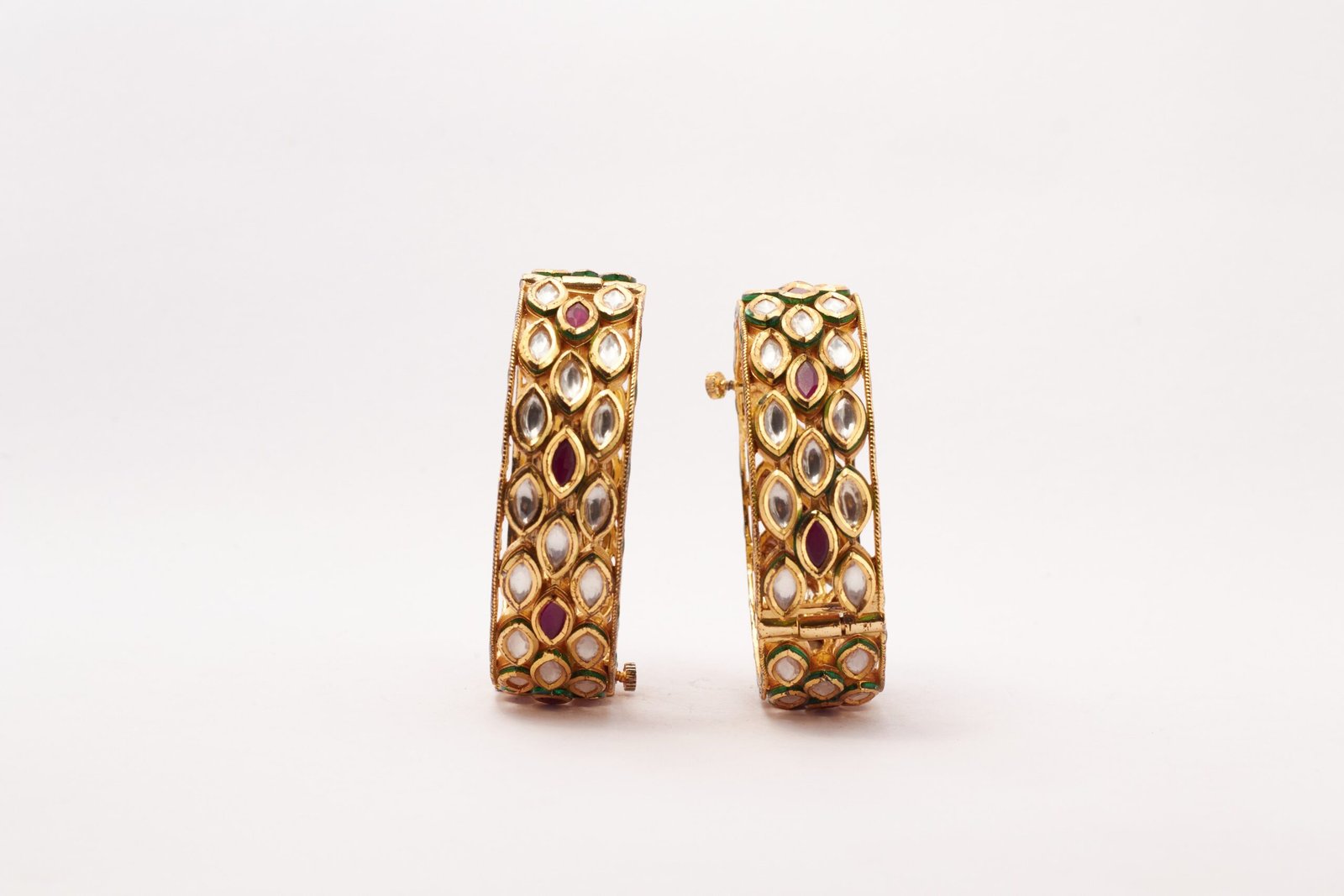 Adorn your wrists with the enchanting allure of our “Golden kundan Opulent Bangles,” where the elegance of pear-shaped design meets the vibrant richness of red and natural stones. Each bangle in this set features a captivating pear-shaped design, meticulously crafted to resemble delicate petals. The design is adorned with a harmonious combination of deep red and natural stones, creating a cascade of colors that adds a touch of drama and sophistication. The golden finish of the bangles enhances the opulence of the design, creating a seamless fusion of warmth and glamour. Whether you’re attending a special occasion or seeking to make a bold statement with your everyday ensemble, these bangles are the perfect choice.