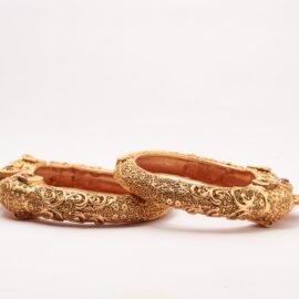 This designer pair of bangles has golden finish.it has an elegant quadrangle blocks well placed on it. These square blocks are adorned with meenakari of mint colour and coloured stones. It is very delicate and light to carry. This aesthetic piece of jewelry complements traditional outfits.