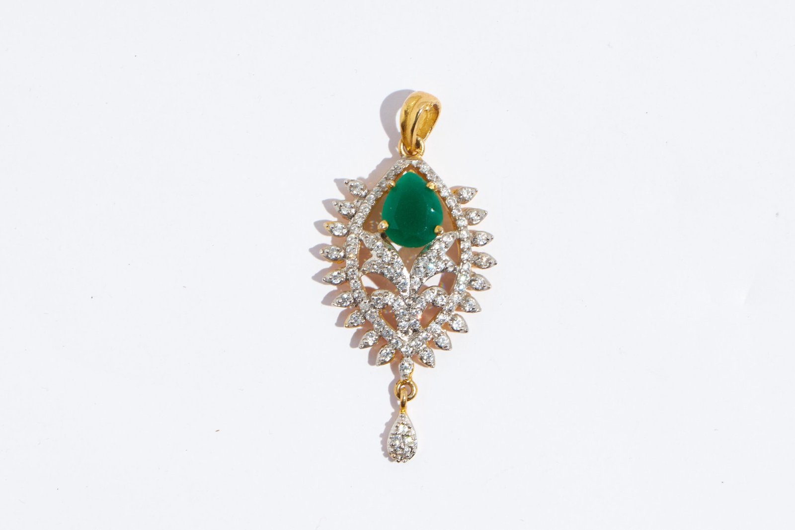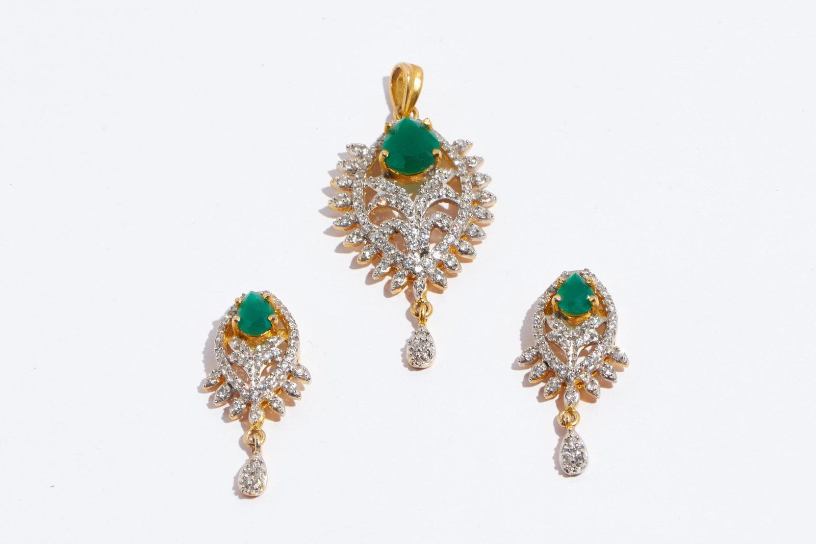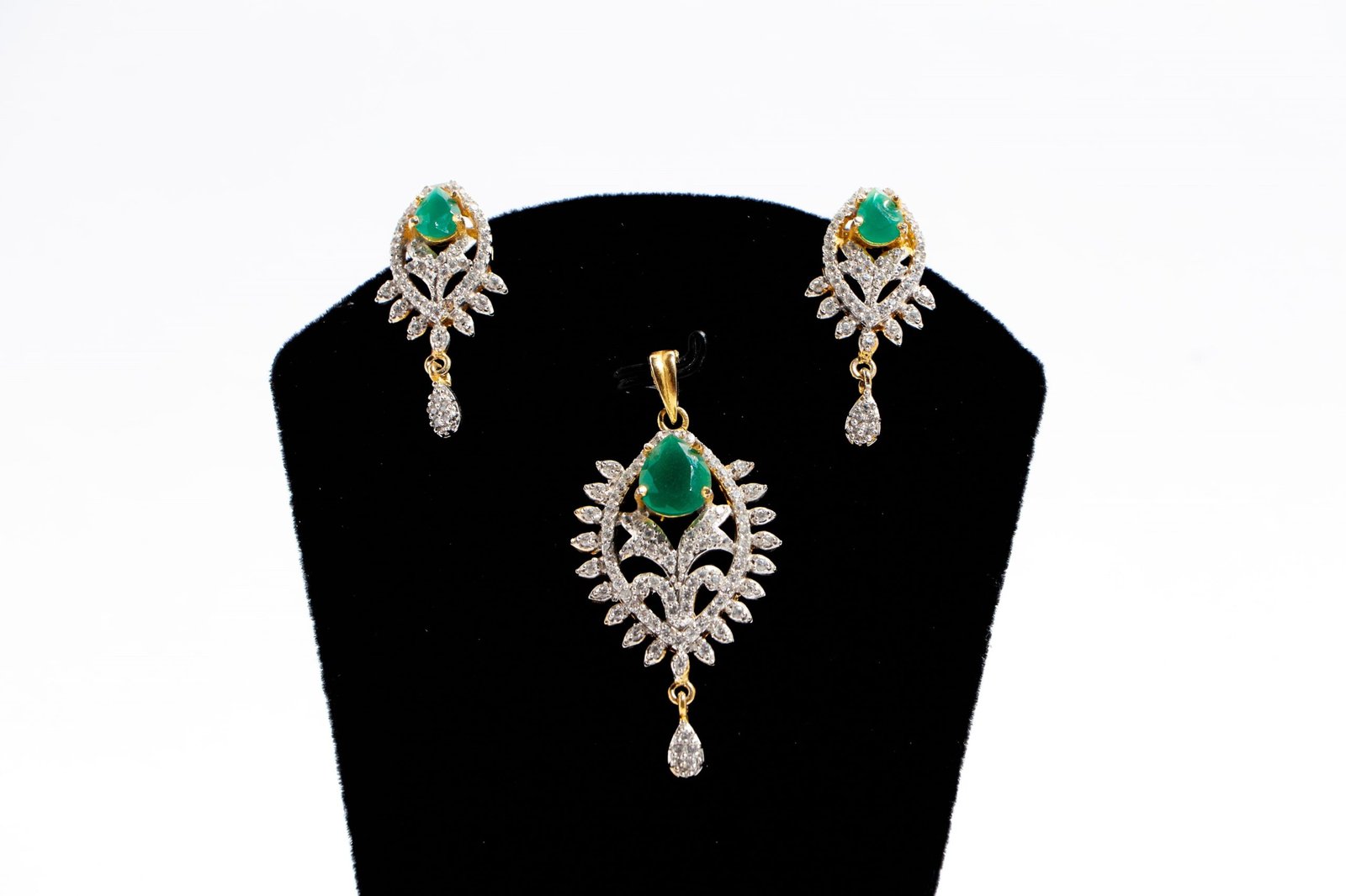 This pendant set is an exquisite type of jewelry that's sure to turn heads. The centerpiece of this pendant set is a dazzling green stone that sparkles and shines from every angle, creating an alluring and eye-catching effect. Surrounding the green stone are a series of s himmering zirconia stones, carefully arranged in a unique and intricate design that adds depth and dimension to thepiece. The pendant set is finished in a luxurious golden finish that adds warmth and sophistication to the overall aesthetic. Whether you're dressing up for a special occasion or simply adding a touch of elegance to your everyday look, it is the perfect choice.It has a superb colour combination.It is skin friendly too!