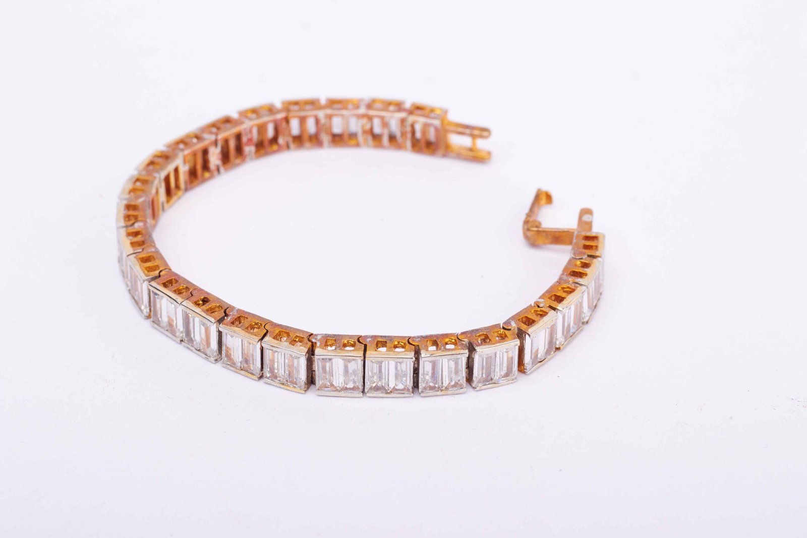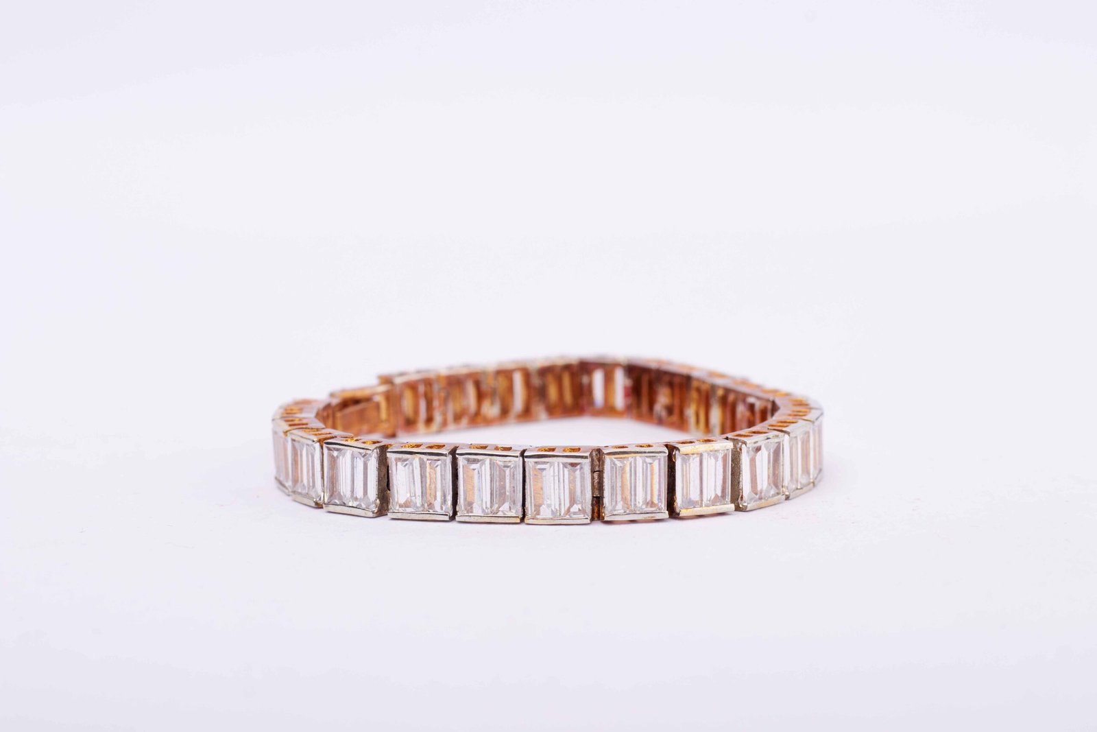 This bracelet is a fusion of warmth and contemporary elegance. The copper finish enhances the bracelet’s allure, adding a sense of luxurious charm. The baguette-cut stones, meticulously arranged, create a sleek and modern aesthetic, catching the light with every movement.