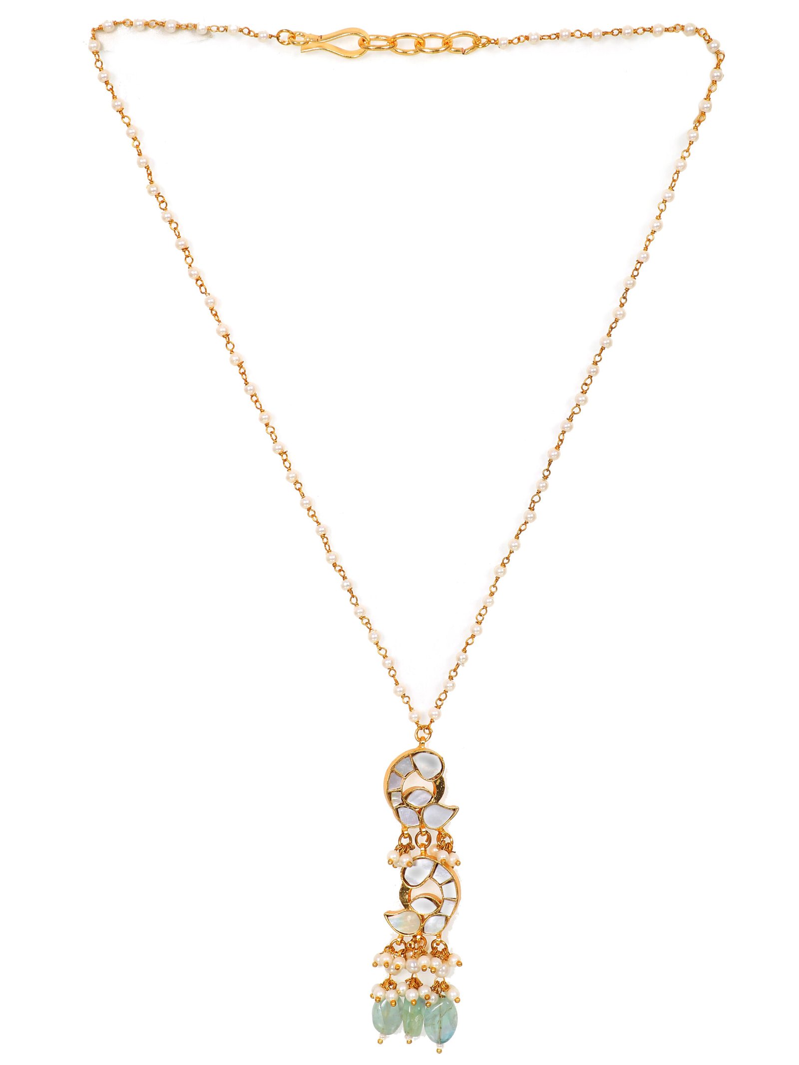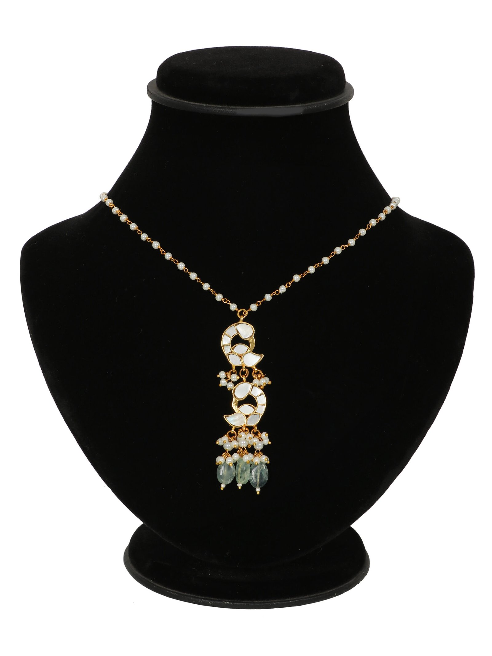 add a touch of grace to your look with this stunning, peacock kundan peacock kundan pendant set. Featuring intricate, peacock shaped pattern with dangling beads, this elegant piece is perfect for festival occasions, and special celebrations.. It is a very chic design and skin friendly too.
