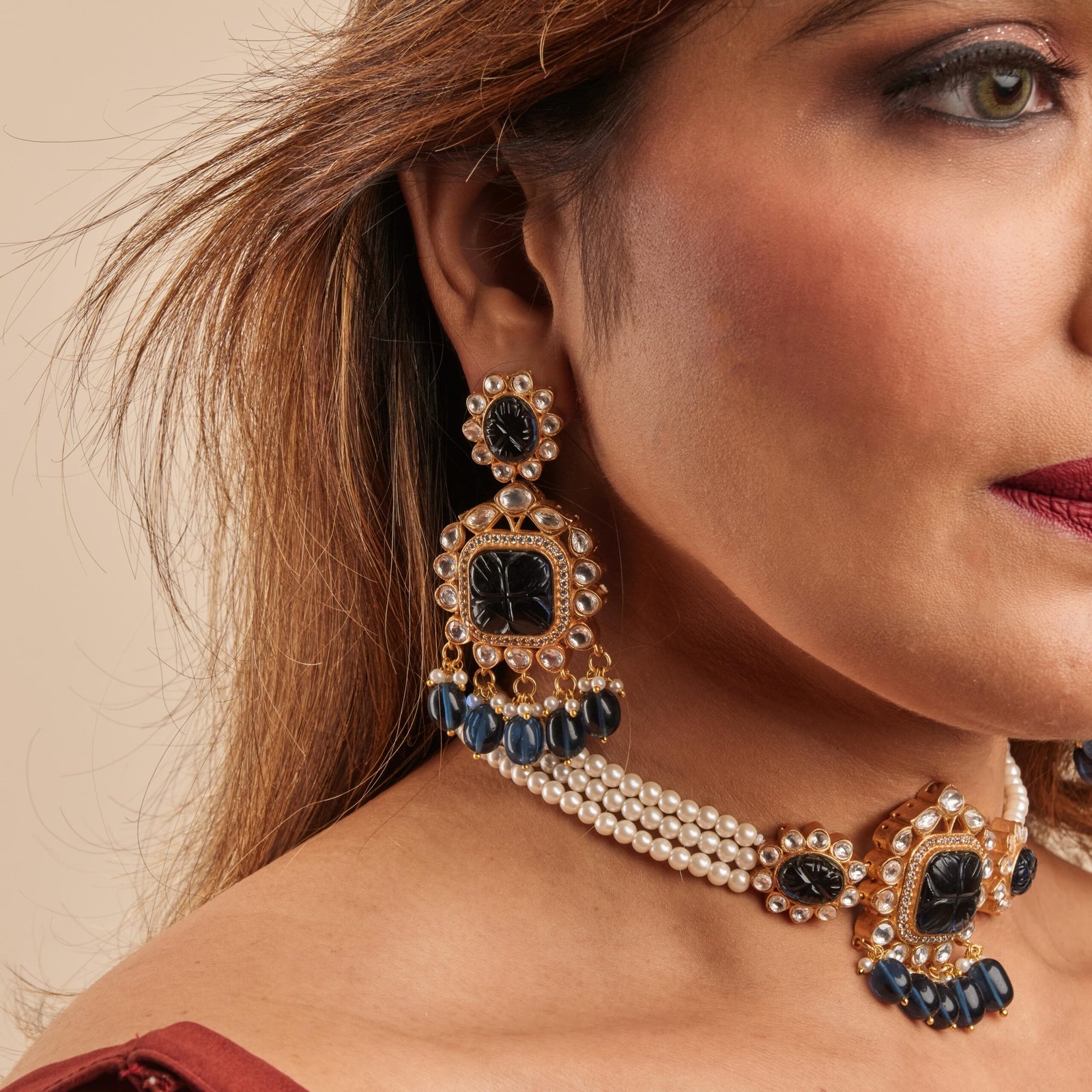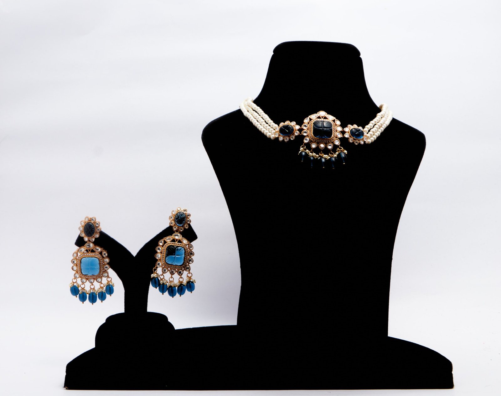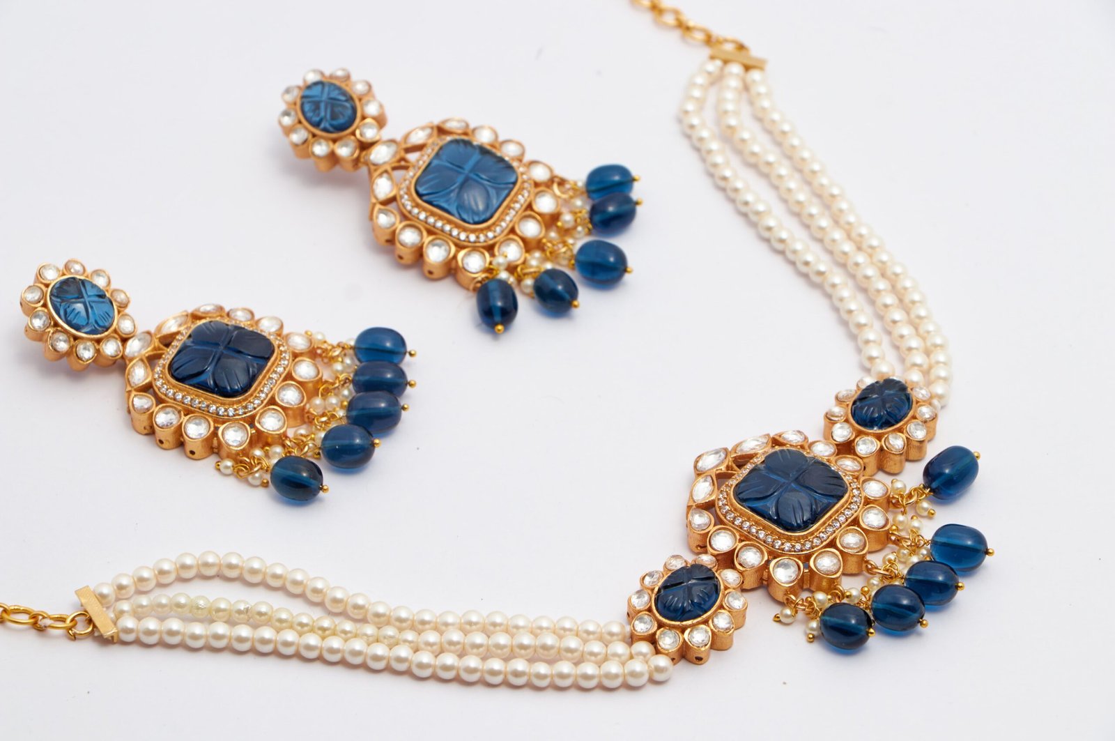 This Neckset Is A Fusion Of Exquisite Kundan And Blue Carved Stone. It Has Golden Finish And Very Light To Carry. The Striking Colour Combination Gives It A Very Unique Look. It Is A Tredy Design And Perfect For All Age Groups. It Has A Pearl String Attached And Delicate Pearl And Stone Hangings. It Complements all Kinds Of Ethnic Attires. It Is A Must Have Piece!
