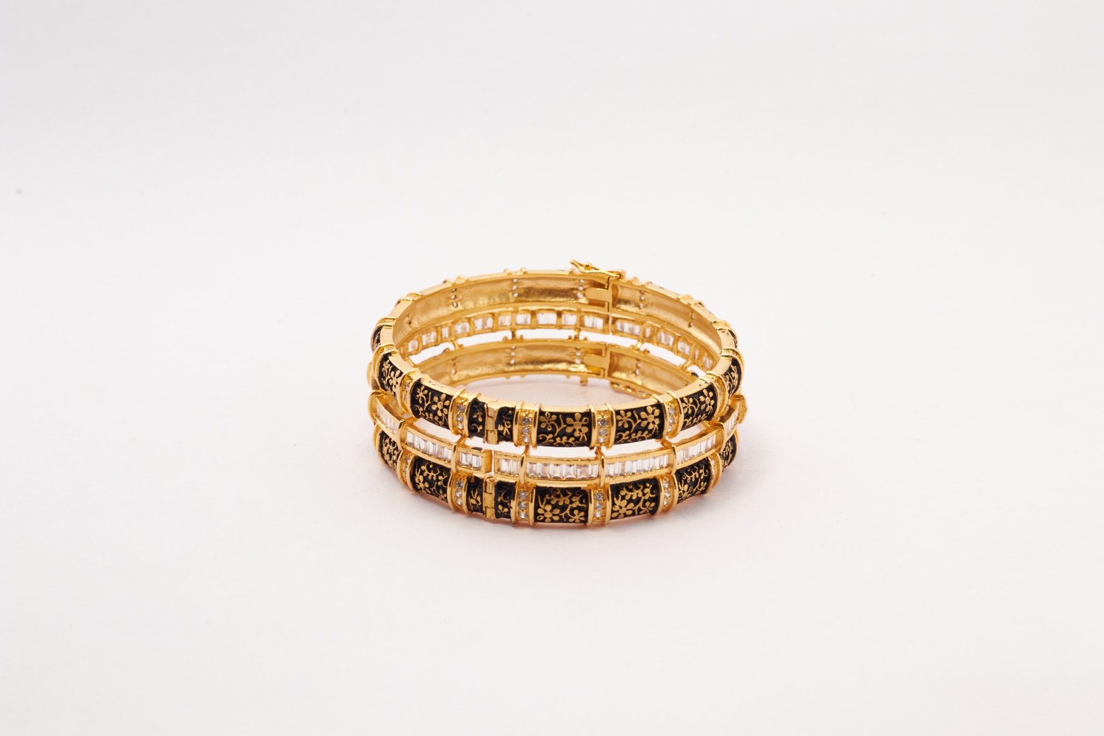 Embrace the fusion of elegance and contrast with our ” Noir Floral Elegance Bangles.” These bangles are a tribute to the captivating beauty of intricate design and artistry. The black finish is adorned with a stunning floral design in radiant golden hues, creating a striking contrast that evokes a sense of drama and sophistication. The combination of the two finishes adds a touch of mystery and opulence to your ensemble. Nestled within the central layer of the bangles are glistening stones, adding a brilliant and captivating allure. These stones elevate the design to create a perfect blend of classic and contemporary elements. Wearing the “Noir Floral Elegance Bangles” is more than just adorning yourself with jewelry; it’s an opportunity to make a statement of artistry and individuality. Whether you’re attending a special event or looking to enhance your everyday look, these bangles are the perfect choice.