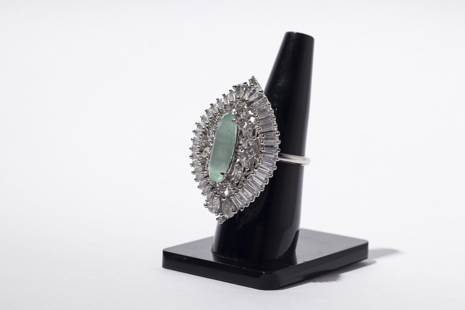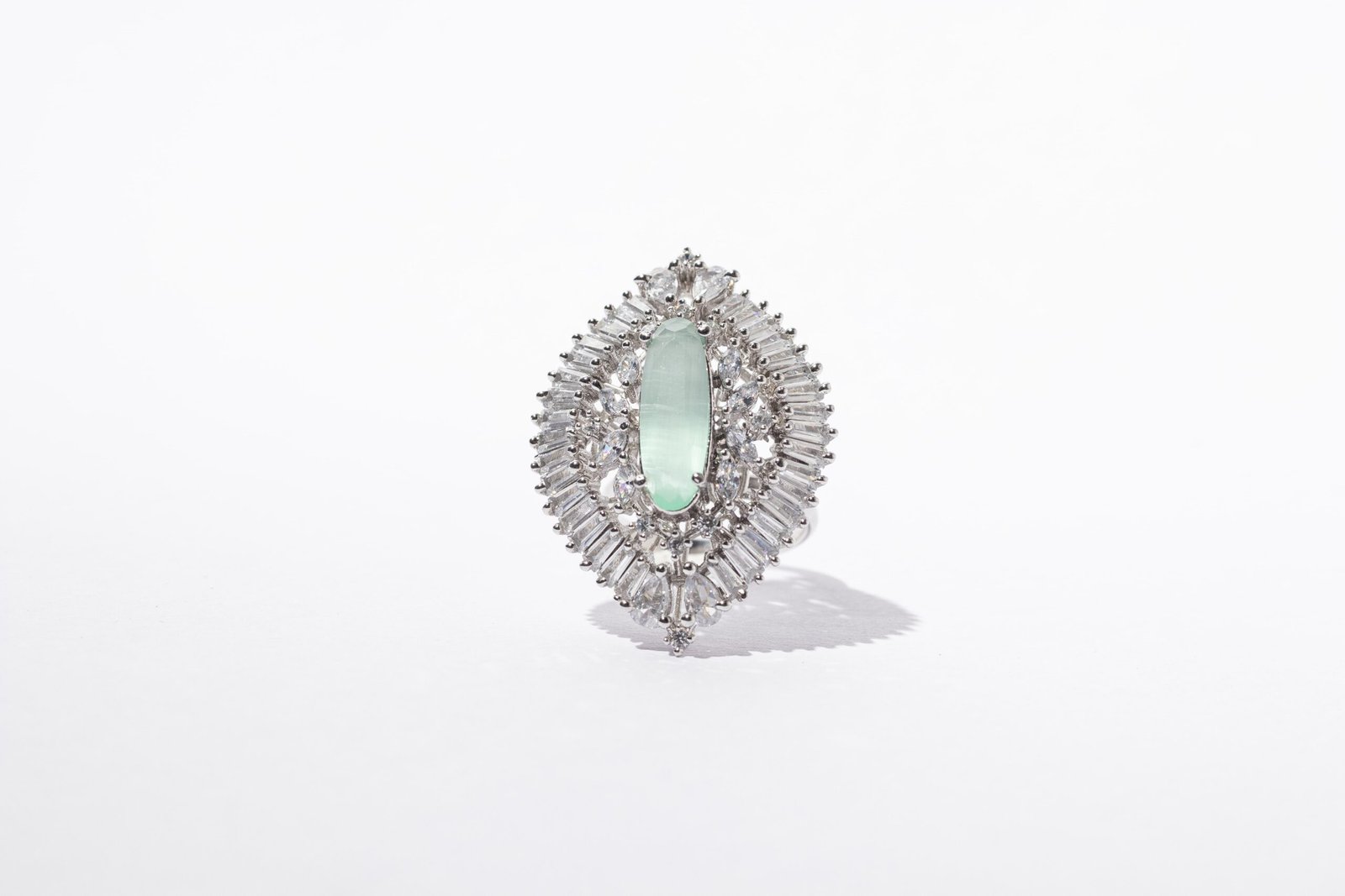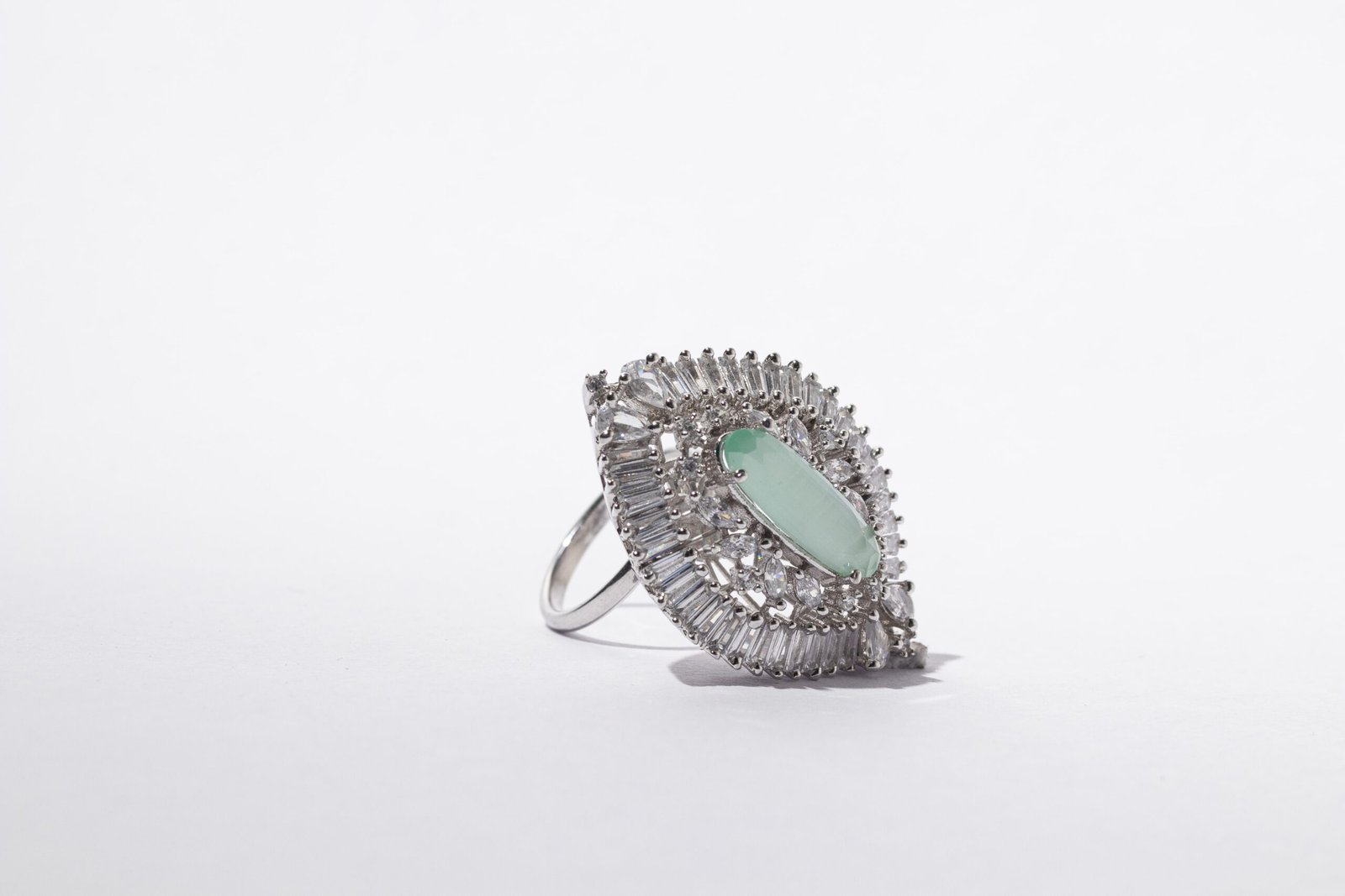 This cocktail ring is superb! It has rhodium finish and elliptical shaped. It has exclusive setting of zirconia all around the attractive semi precious mint green stone.it is really very vibrant.it complements all kinds of attires.it is skin friendly!