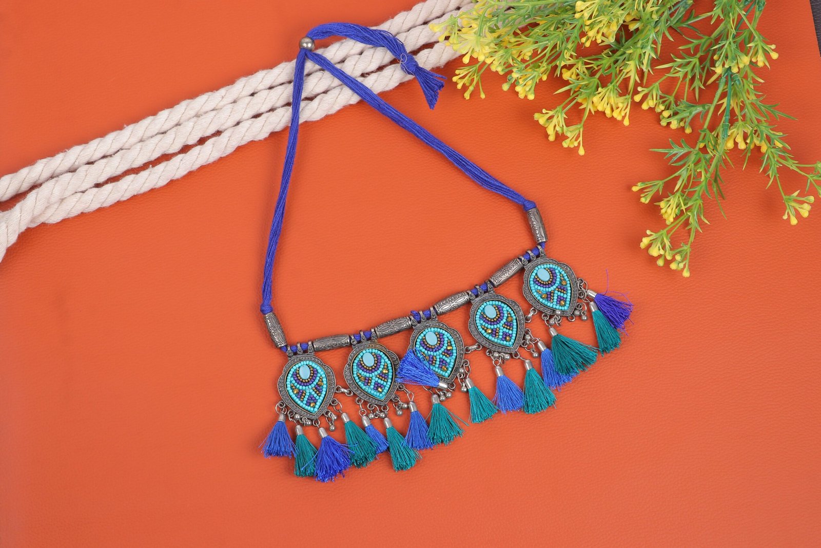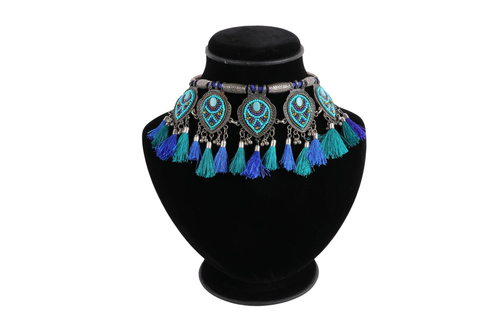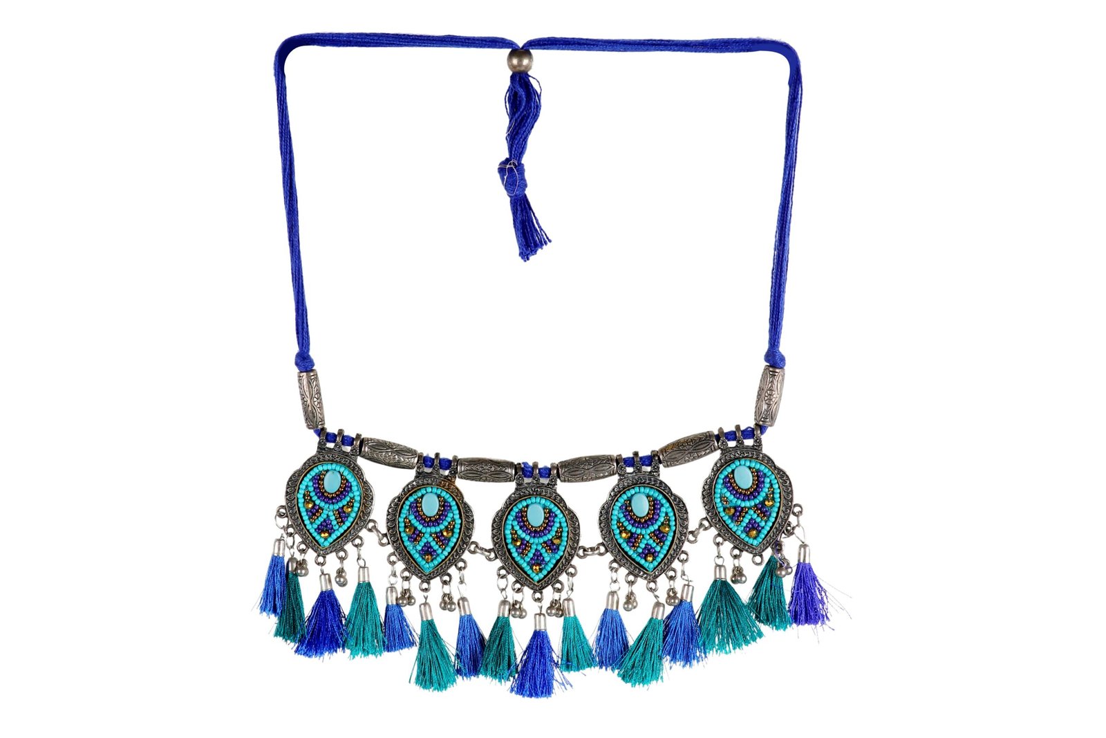 Embrace the vibrant beauty of our Peacock Splendor German Silver Necklace. This eye-catching piece features a series of intricate pendants inspired by peacock feathers, adorned with colorful beads in shades of blue, turquoise, and green. The pendants are accentuated with silver tassels and vibrant thread fringes, adding a playful and dynamic element to the design. Perfect for festive occasions, cultural events, or adding a splash of color to your everyday attire, this necklace is a true statement piece. Celebrate the charm and elegance of peacock-inspired artistry with this stunning accessory.