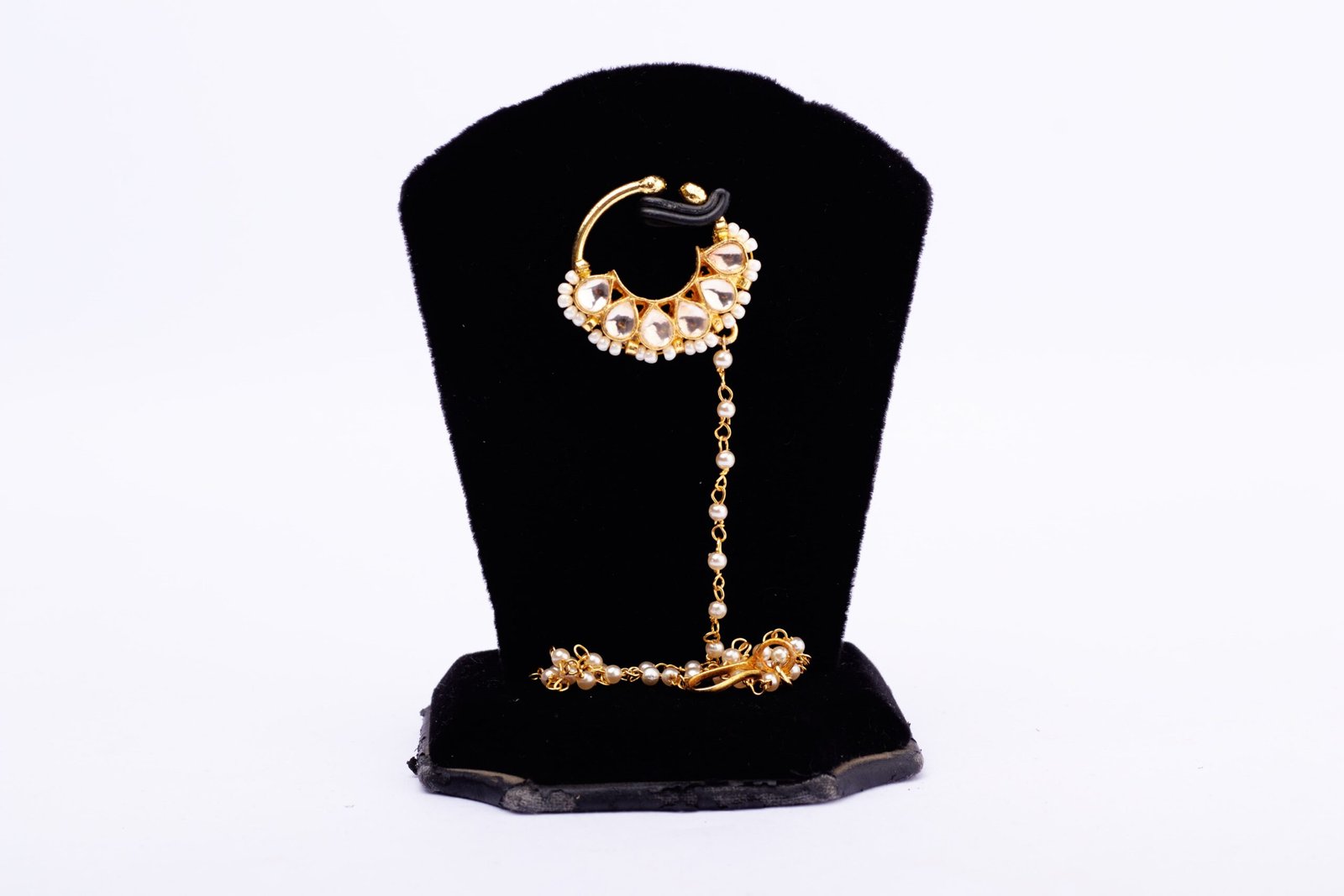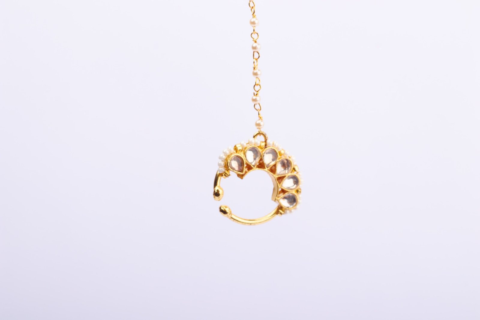 The chain of the nose ring is adorned with small pearls, enhancing its beauty and adding an extra layer of elegance to the overall design. Finished with a golden hue, this exquisite nose ring exudes warmth and sophistication, making it the perfect accessory for both special occasions and everyday wear.