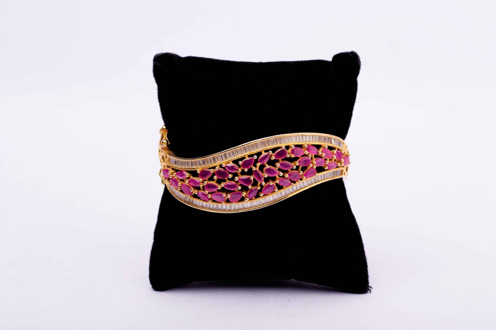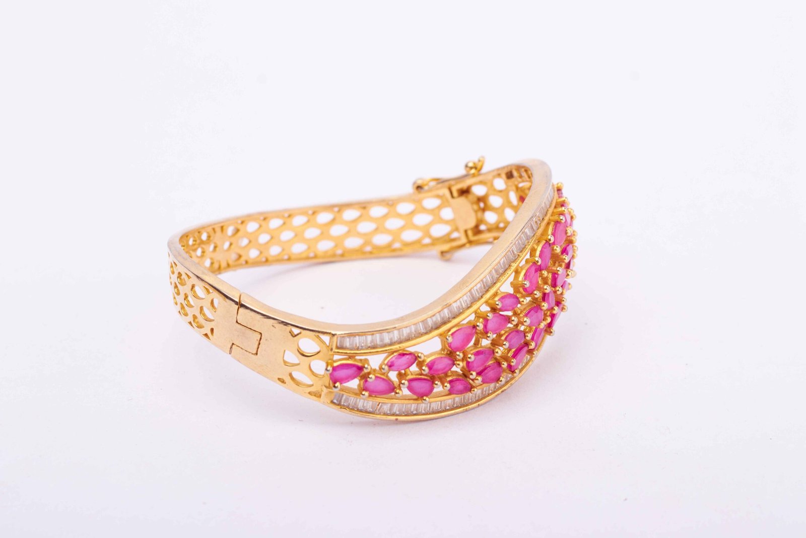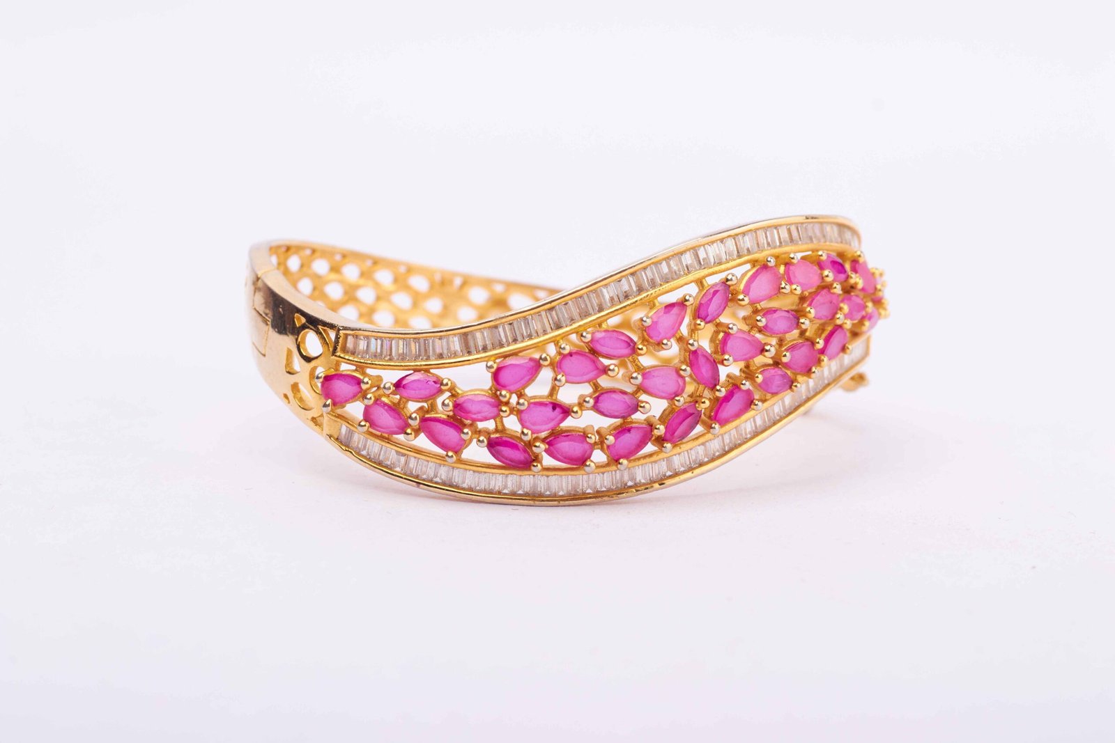 This bracelet is a celebration of movement and sophistication. The wavy design mimics the gentle flow of cascading waves, while the pink stones add a touch of femininity. The line of baguette-cut stones introduces a modern and geometric element, creating a harmonious blend of styles.