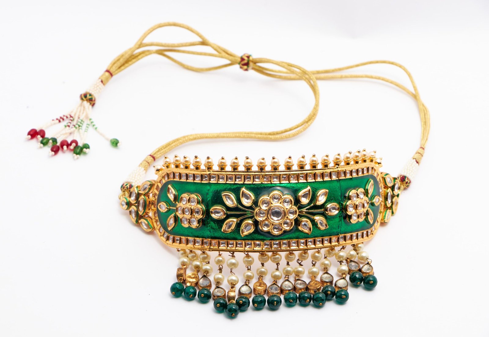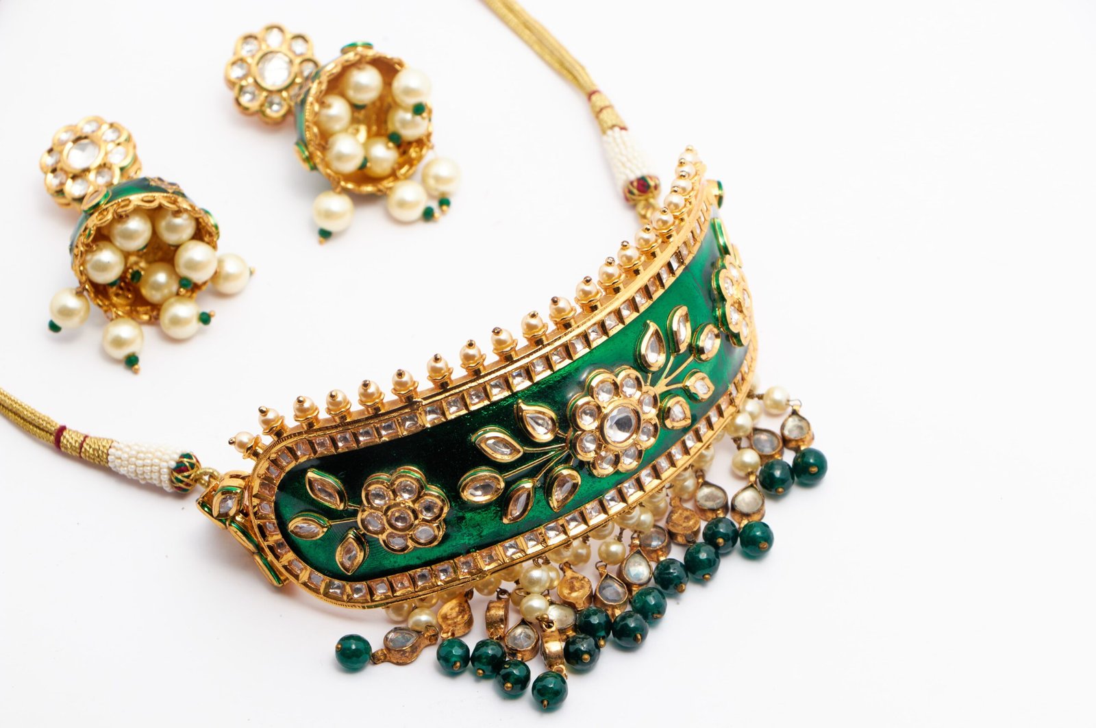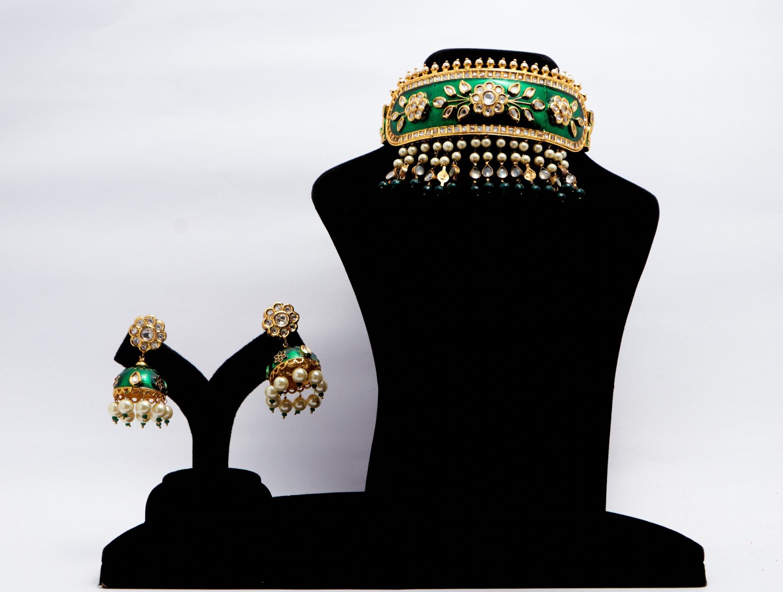 This Elegant Neckset Is Embedded With Superior Quality Kundan And Delicate Pearls. It Has Attractive Floral Motifs Which Catches Attention Of All. It Has Very Fine Gold Polish And Perfect Ethnic Wear.It Comes With A Beautiful Pair Of Jhumkis. The Emerald Colour Is Very Impressive Indeed!