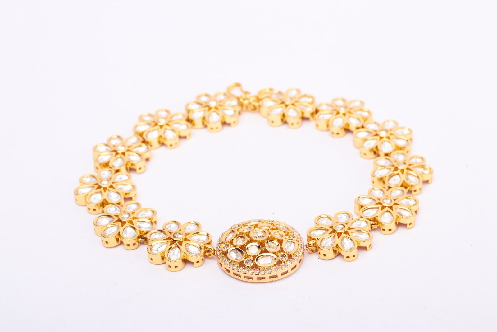 Surrounding the central circle, delicate zirconia accents add a touch of brilliance and sophistication, enhancing the overall allure of the piece. The intricate flower-shaped design, adorned with gleaming stones, adds a whimsical and feminine touch to the sheesh patti, making it a truly enchanting accessory.
