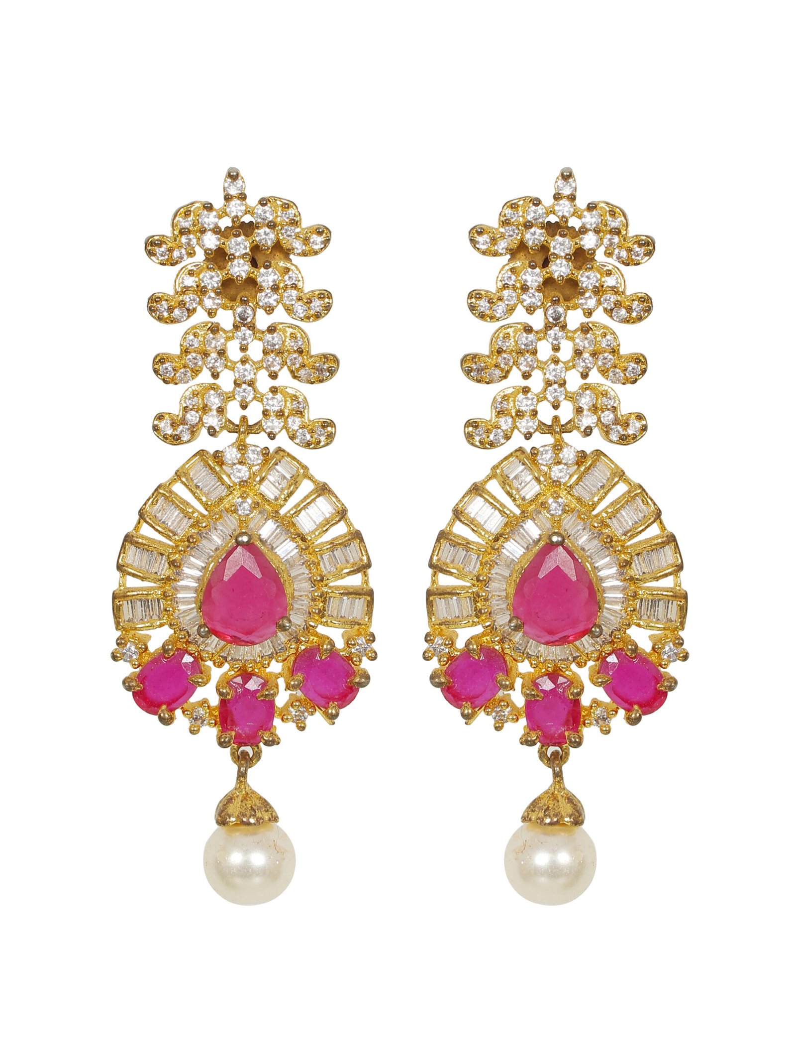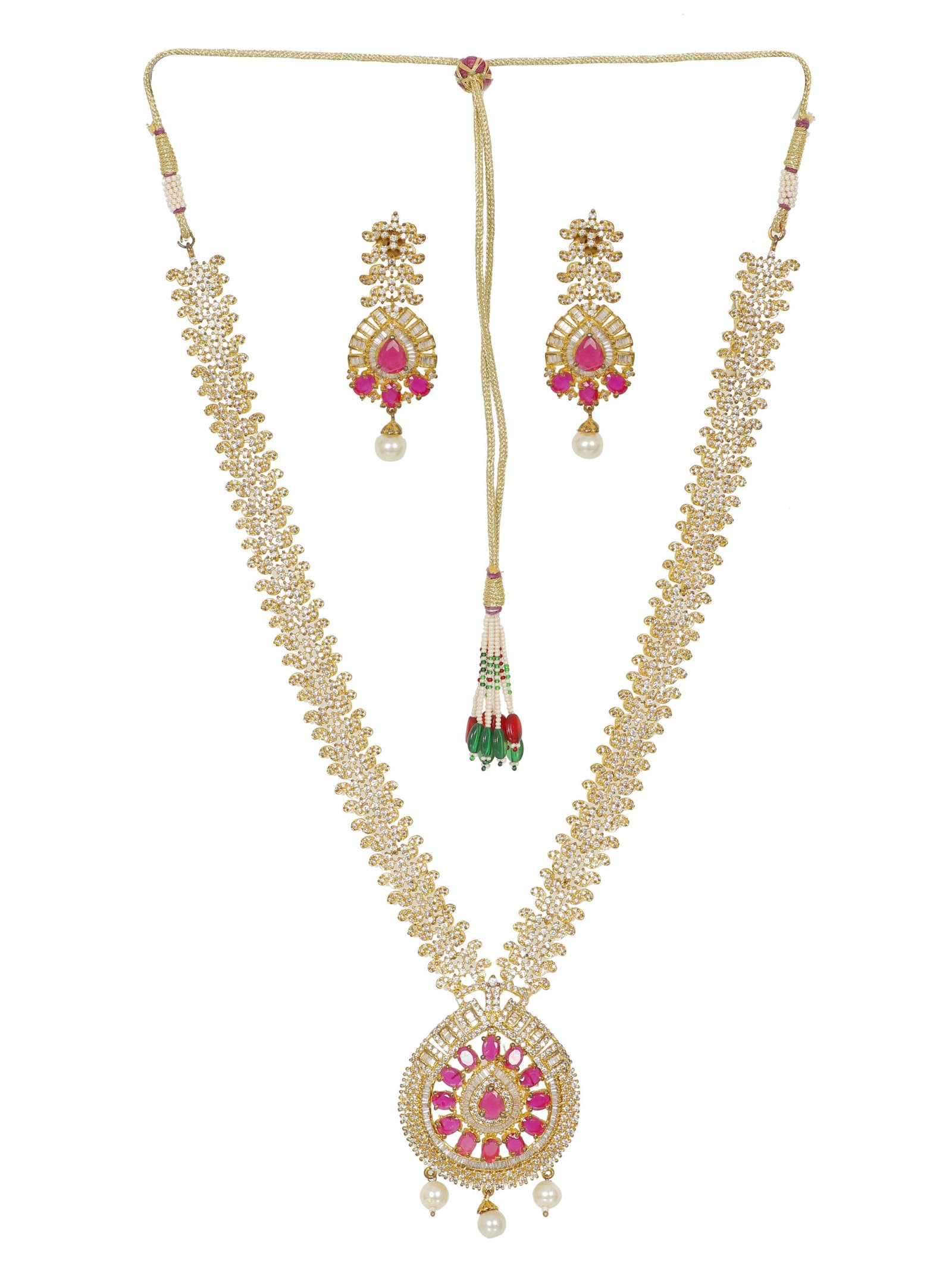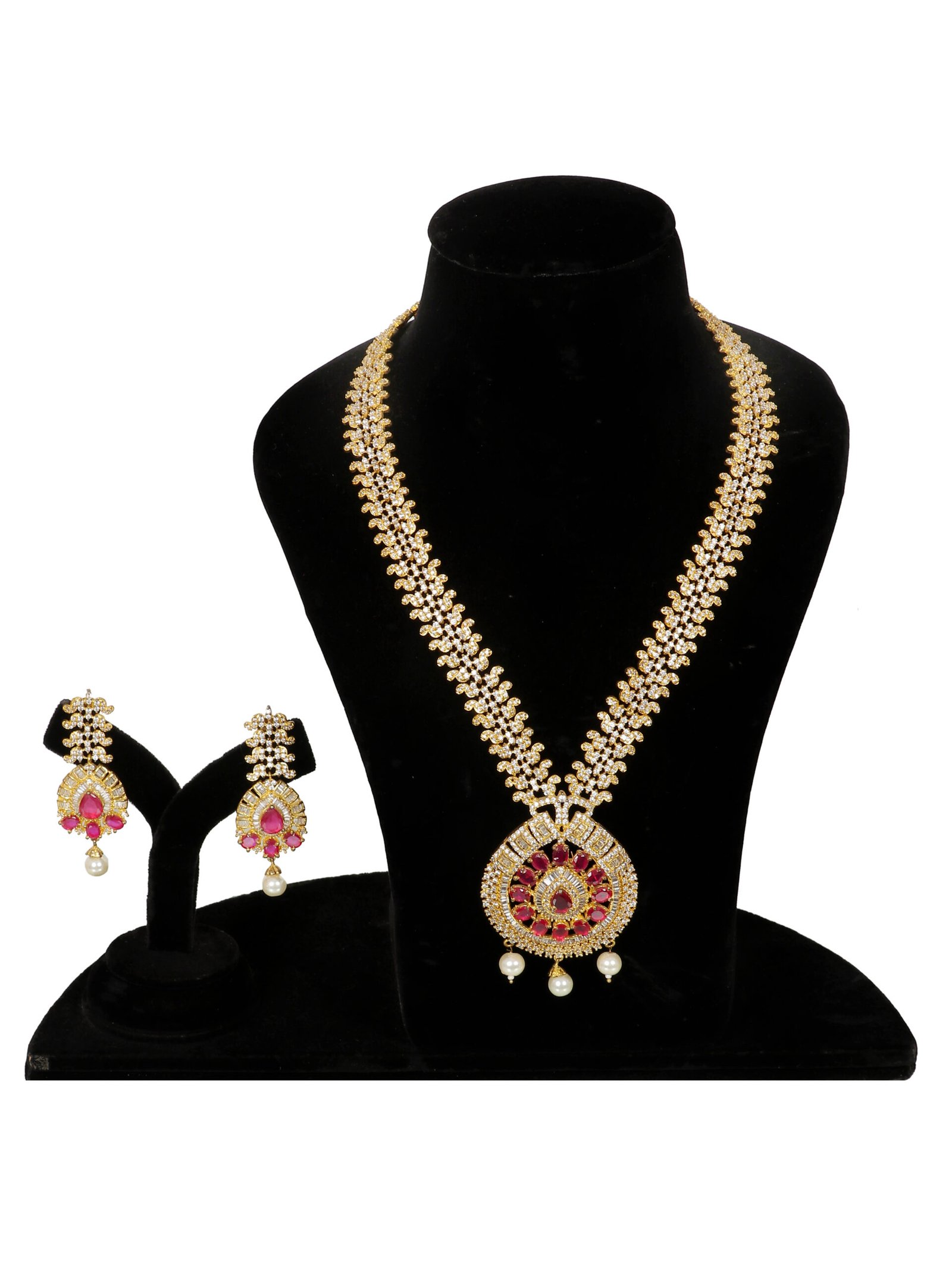 Elevate your style with this exquisite gold plated necklace set, featuring a stunning ruby studded centerpiece complemented by elegant pearl danglers. crafted with intricate detailing the necklace showcases a unique pattern of gold and crystal embellishments, creating a regal and timeless appeal. the set includes matching earrings that mirror the intricate design, making it the perfect choice for weddings ,festive occasions, or traditional celebration. lightweight and durable, this jewelry set ensures comfort without compromising on style.add a touch of sophistication to your ensemble with this must-have accessory.
