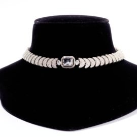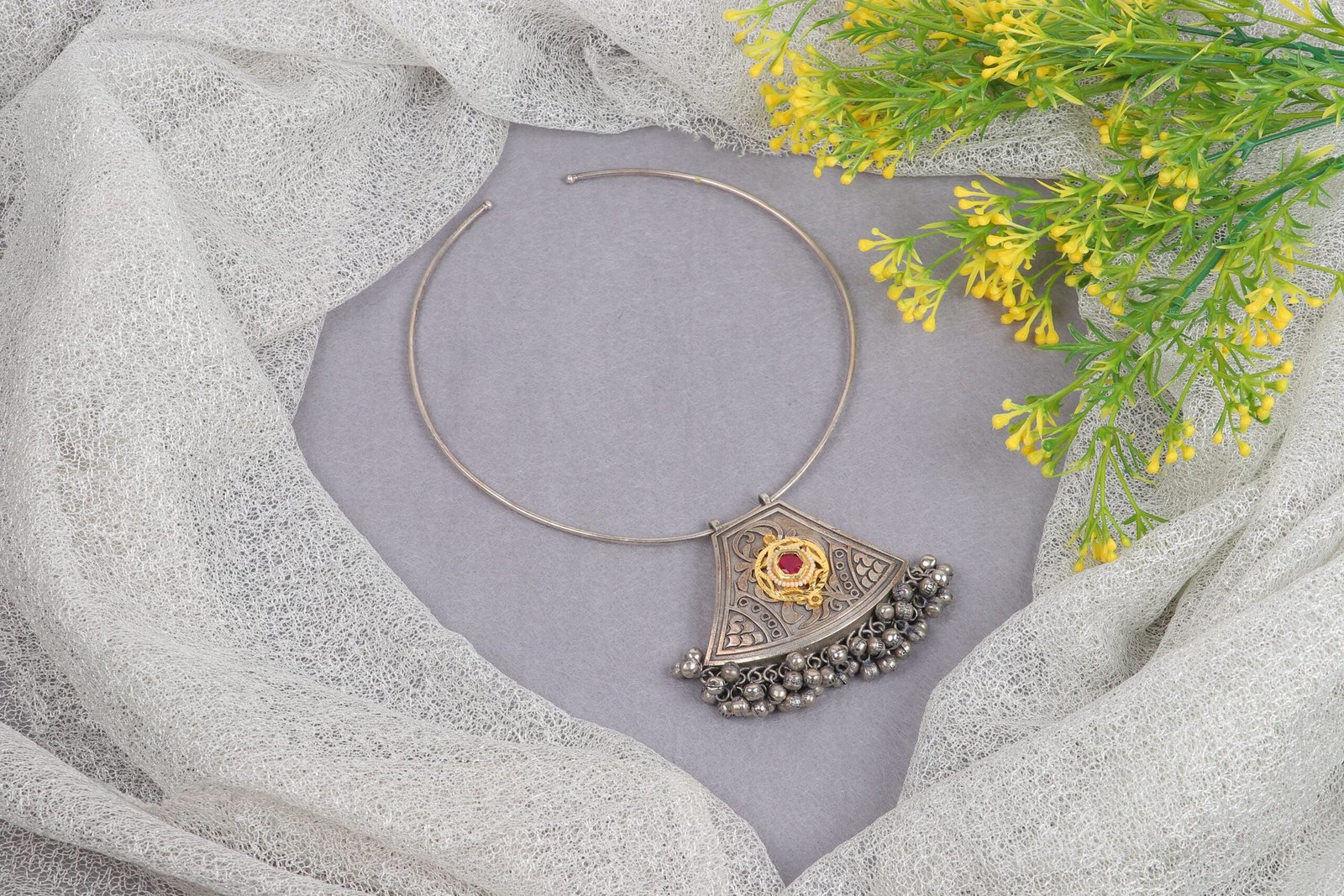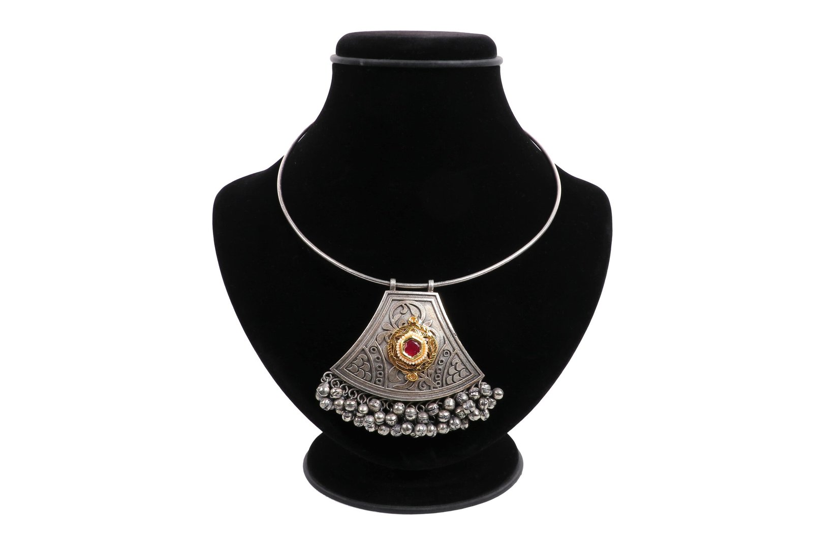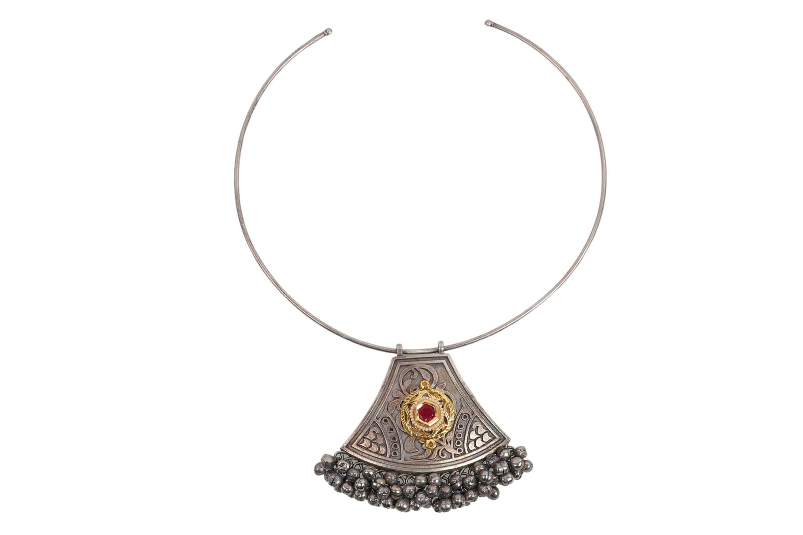 Step into the spotlight with our Regal Elegance German Silver Choker Necklace. This striking piece features a fan-shaped pendant adorned with intricate engravings and highlighted by a central ruby-red stone encircled by golden details. The necklace is finished with a fringe of delicate silver beads, adding a touch of playful sophistication. Perfect for special occasions or to elevate your everyday style, this choker embodies a blend of traditional craftsmanship and contemporary design. Embrace the timeless beauty and versatility of this stunning accessory.