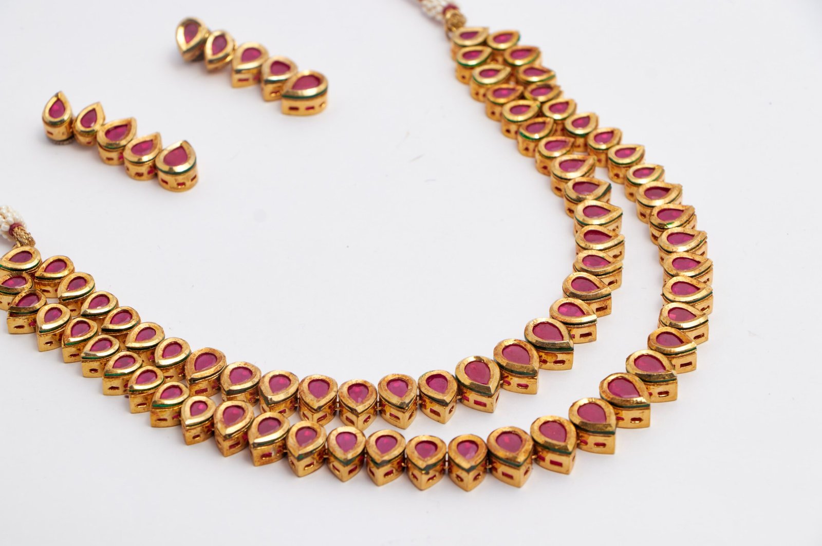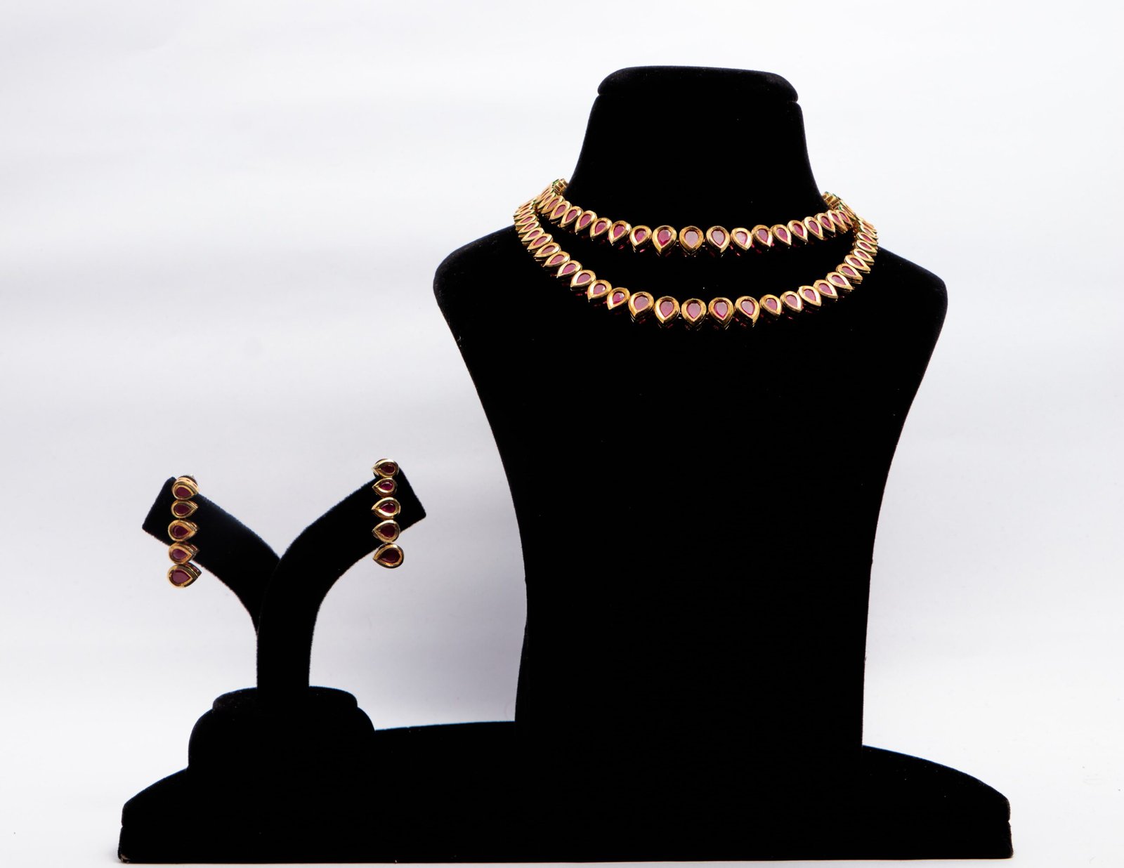 This Exquisite Two Layered Necklace Has Fine Cut, Pear Shaped Semi Precious Ruby Stones. It Has Golden Finish And Very Skin Friendly. It Goes Superb With Both Indian As Well As Indo Western Outfits.It Comes With Very Delicate Droplet Earrings.This Colour Matches With Almost All Colours And Gives A Very Classy Look!
