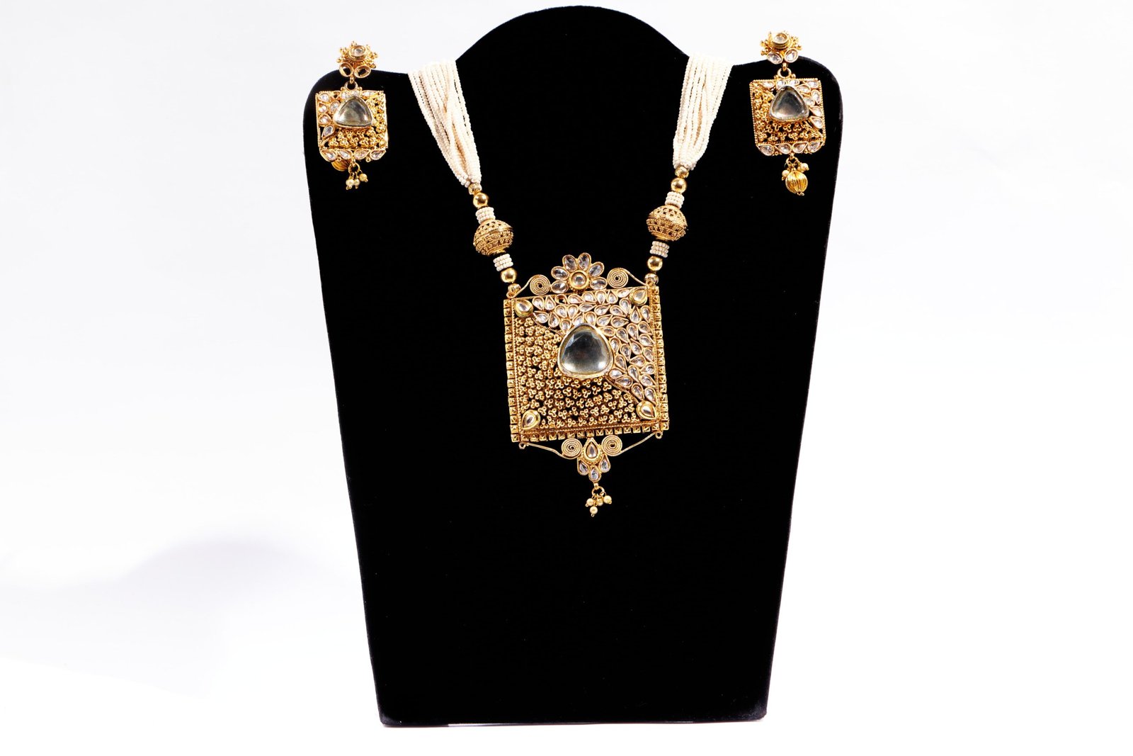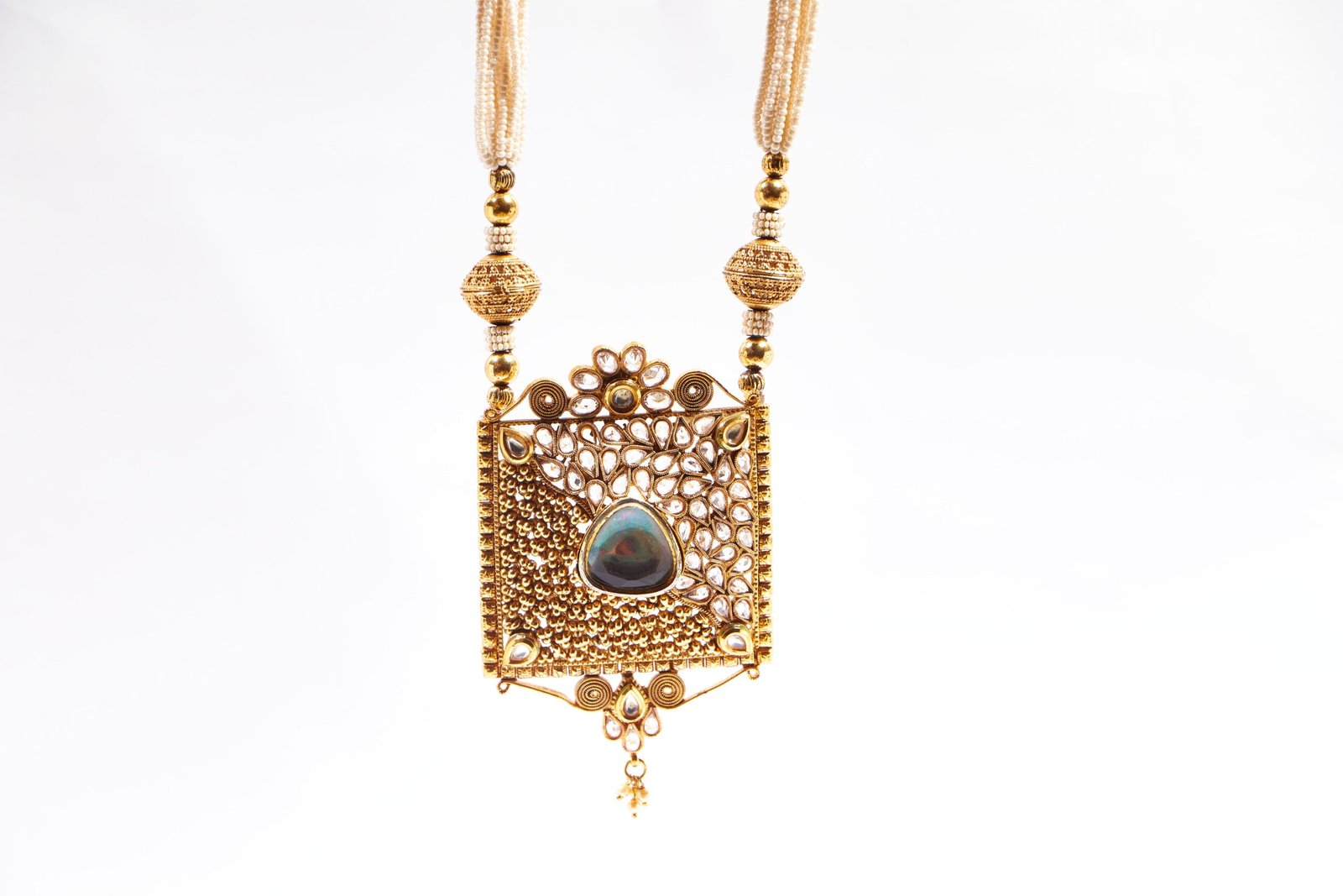 The Royal Grandeur pendant set is a magnificent piece of jewelry that exudes elegance and sophistication. The square design of the pendant has a fine golden finish that gives it a regal appeal, and the superior kundan at the center adds a touch of sparkle that catches the eye. The intricate detailing and unique design of the pendant make it a work of art that is sure to impress. The pendant is suspended from a beautiful white chain that adds a touch of delicacy and femininity to the design. The pearls adorning the chain give it an ethereal and magical quality that is perfect for any formal occasion. The combination of the golden finish, kundan and pearls create a stunning contrast that enhances the overall beauty of the pendant set.