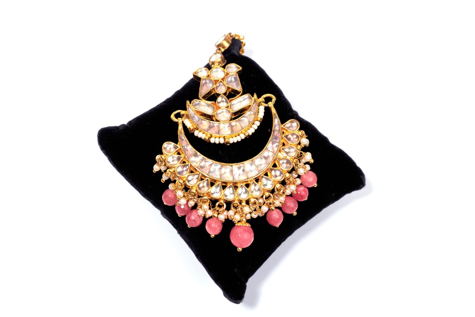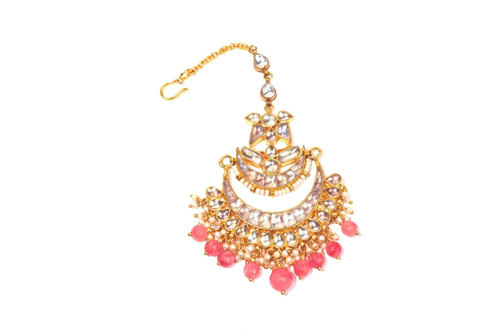 Adorn yourself with the Royal Ruby Crescent Maang Tika, an exquisite piece that combines traditional elegance with a touch of modern flair. This stunning accessory features a golden crescent design embellished with shimmering clear stones, gracefully arranged to reflect the light with every movement. The lower section is adorned with vibrant ruby-like beads, adding a pop of rich color and enhancing the overall regal appeal. Perfect for weddings, festivals, and special occasions, this maang tika will elevate your look and make you feel like royalty.
