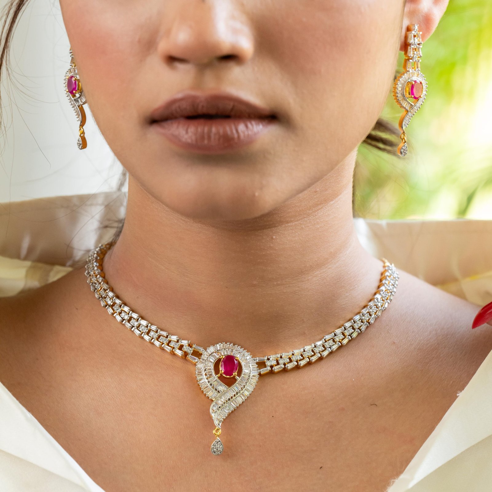 This Charming Piece Of Jewelry Is Artistically Designed With Zirconia And Semi Precious Ruby Stone. It Has Gold Finish And Skin Friendly. It Goes Well With Both Indian And Western Wears.
