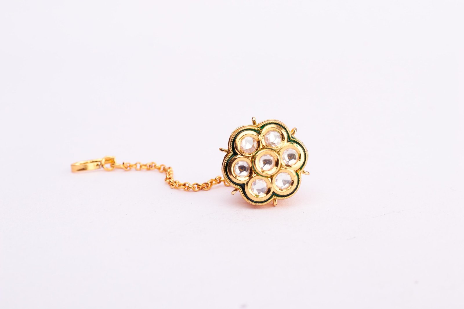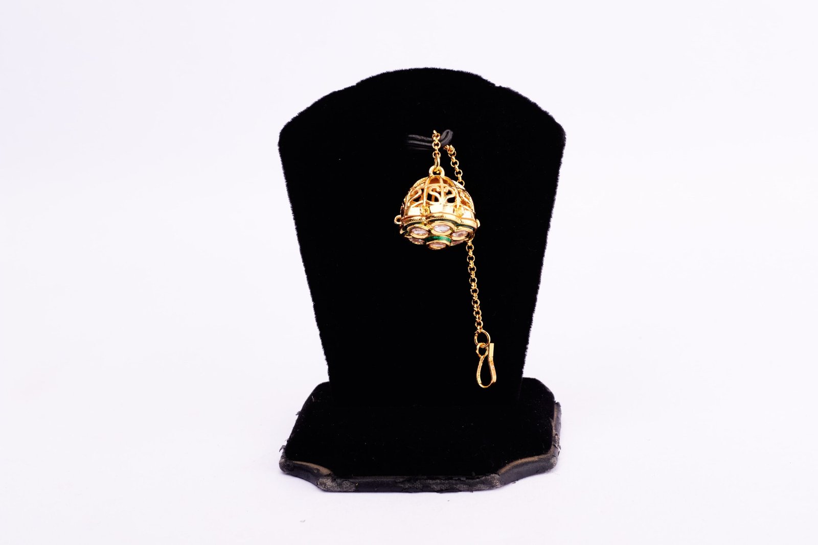Crafted with meticulous attention to detail, this borla features a dazzling array of round-shaped stones arranged in a captivating floral motif reminiscent of a sunburst. The golden finish adds a touch of regal elegance, while the intricate design exudes timeless charm and sophistication.