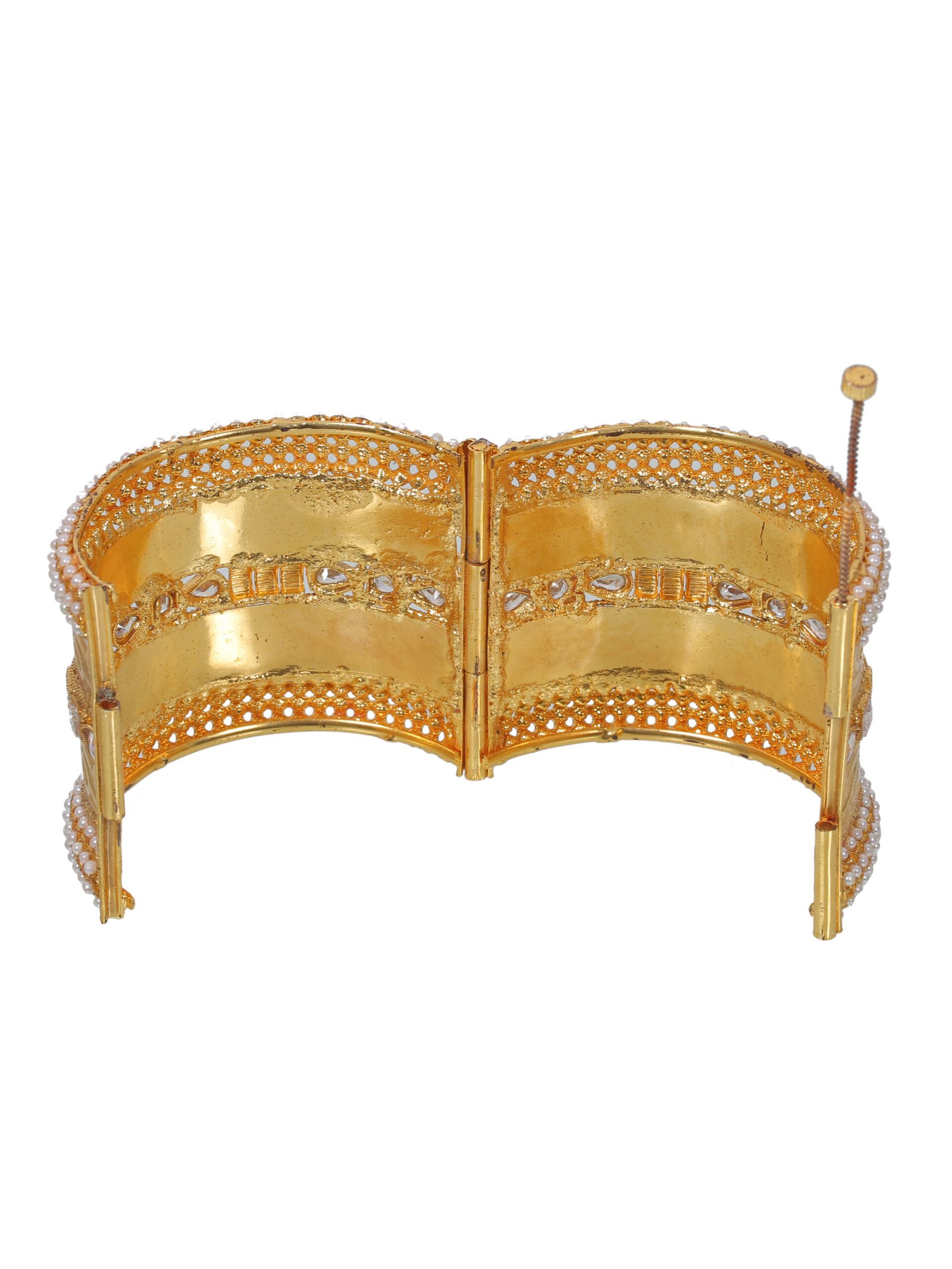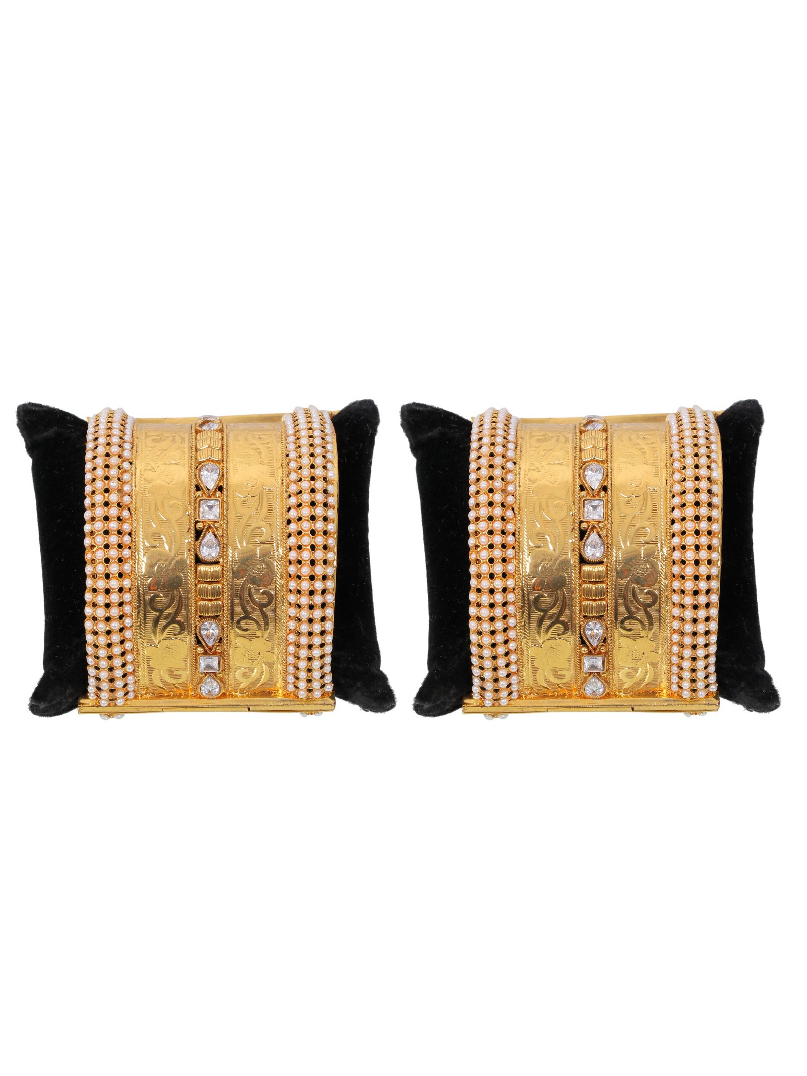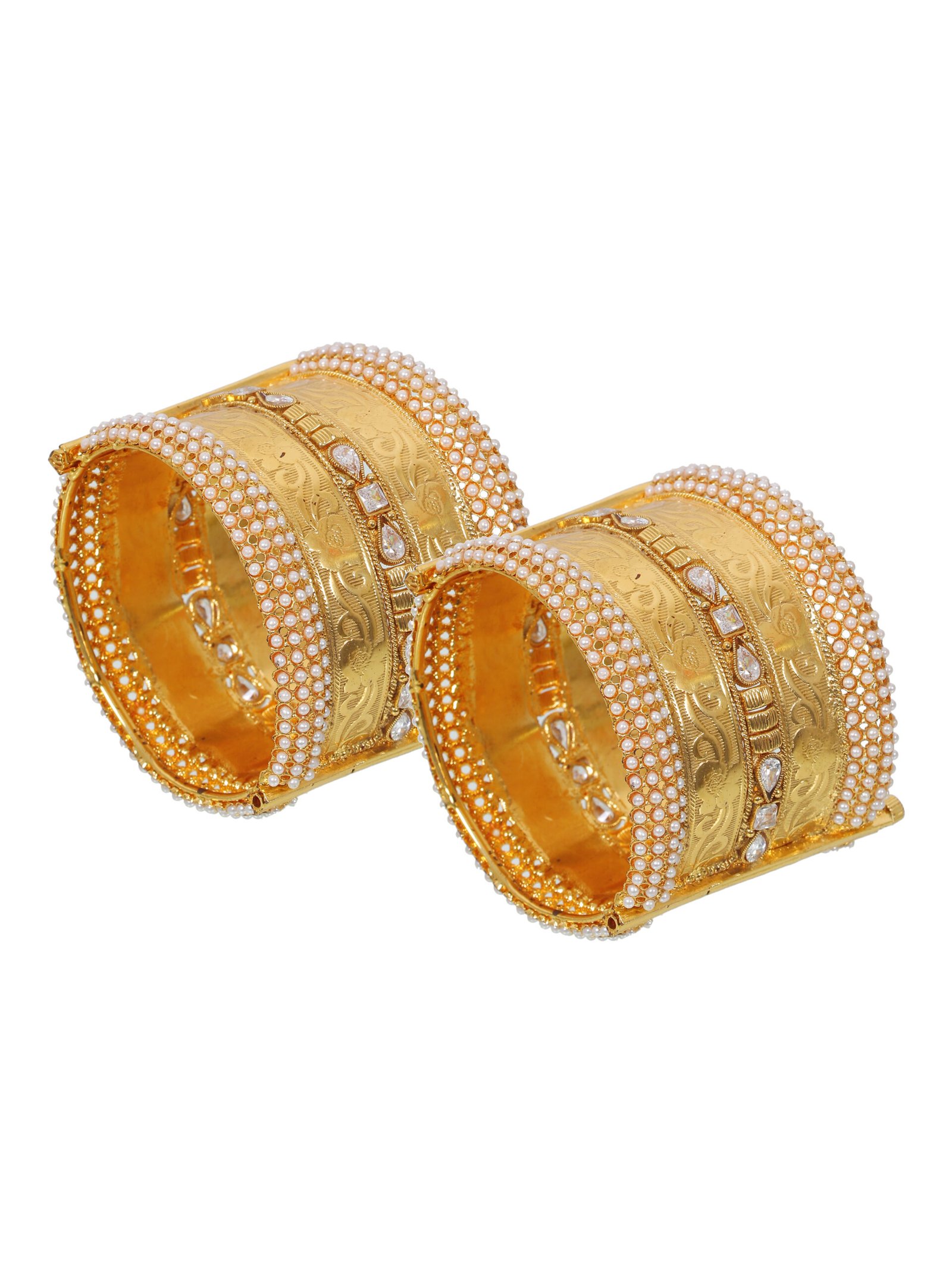 These exquisite gold-toned bangles feature intricate engraved patterns adorned with delicate pearl-like accents and shimmering embellishment. designed to add a touch of elegance to any traditional outfit, they are perfect for weddings, festivals or special occasions. lightweight and durable these bangles provide a comfortable fit while exuding a luxurious charm. A timeless addition to your jewelry collection.