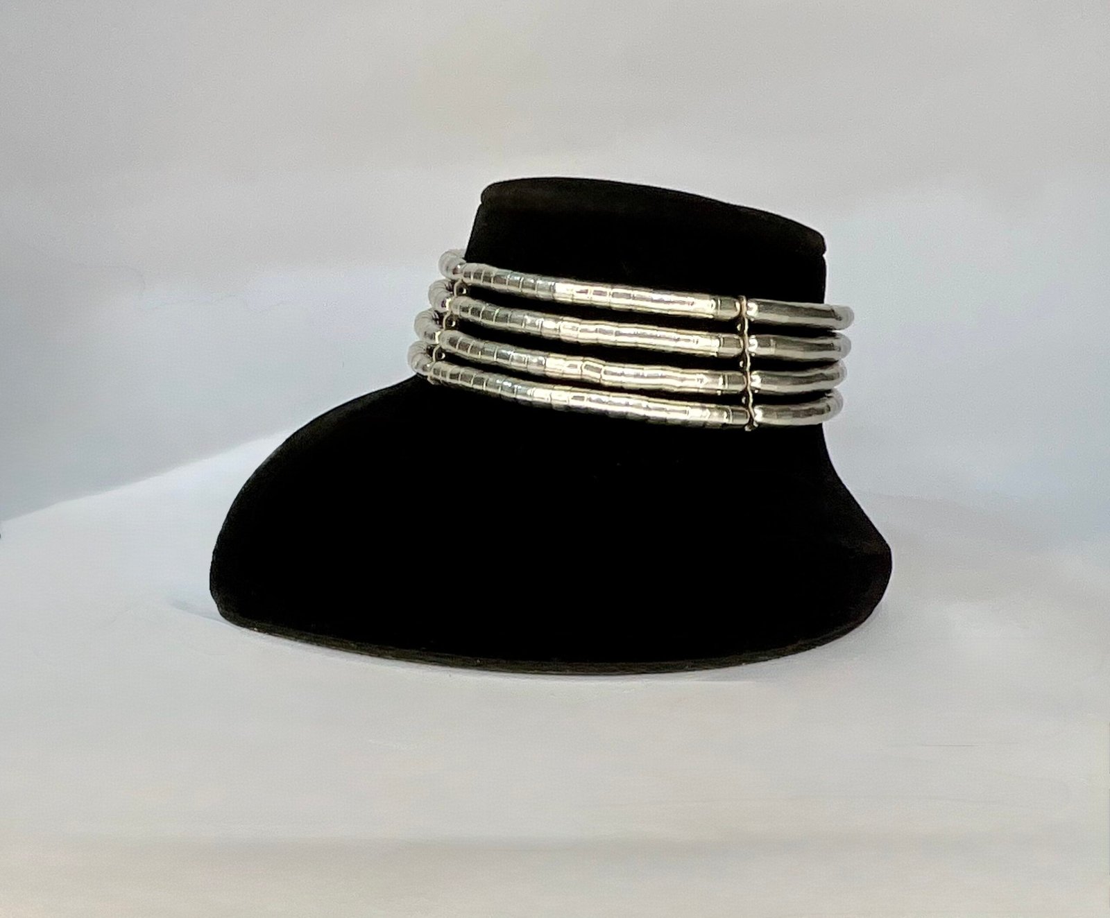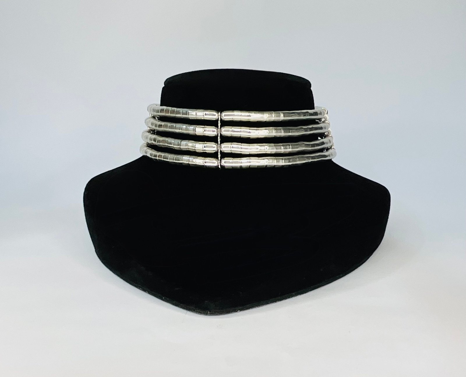 Elevate your ethnic or fusion style with this bold Tribal Silver Torque Choker, featuring five parallel rows of handcrafted silver-tone metal segments. The rigid torque design exudes strength and elegance, while the symmetrical layout adds a powerful statement to any outfit. Ideal for festive occasions, cultural events, or editorial fashion looks, this choker embodies the timeless beauty of tribal craftsmanship with a modern edge. Wear it solo for maximum impact or pair it with matching cuffs to complete your look.