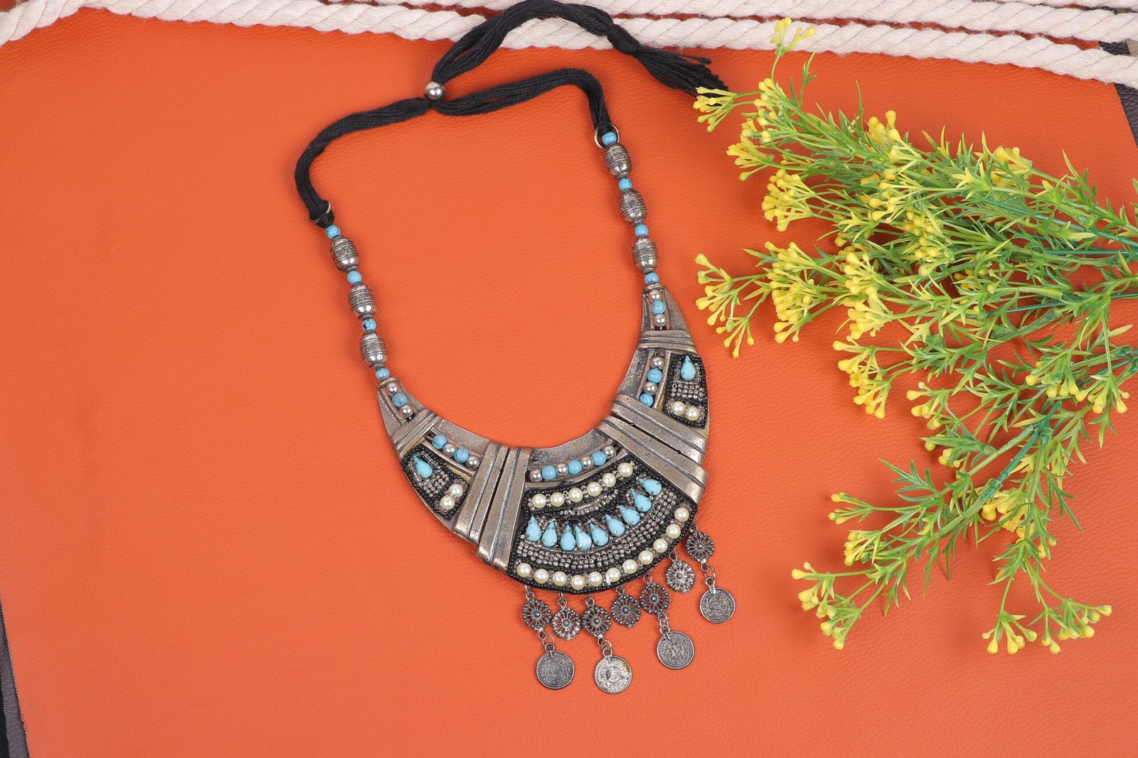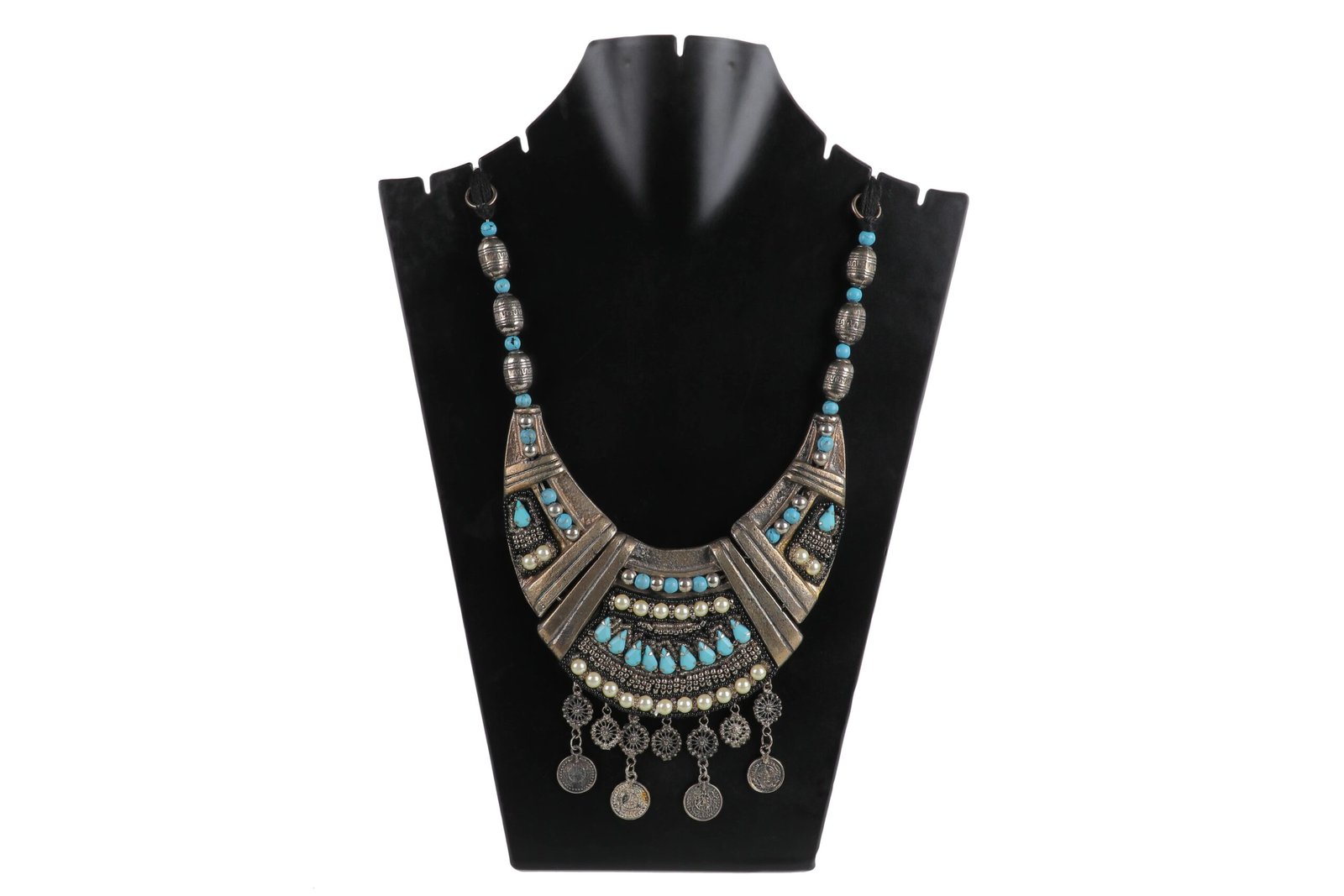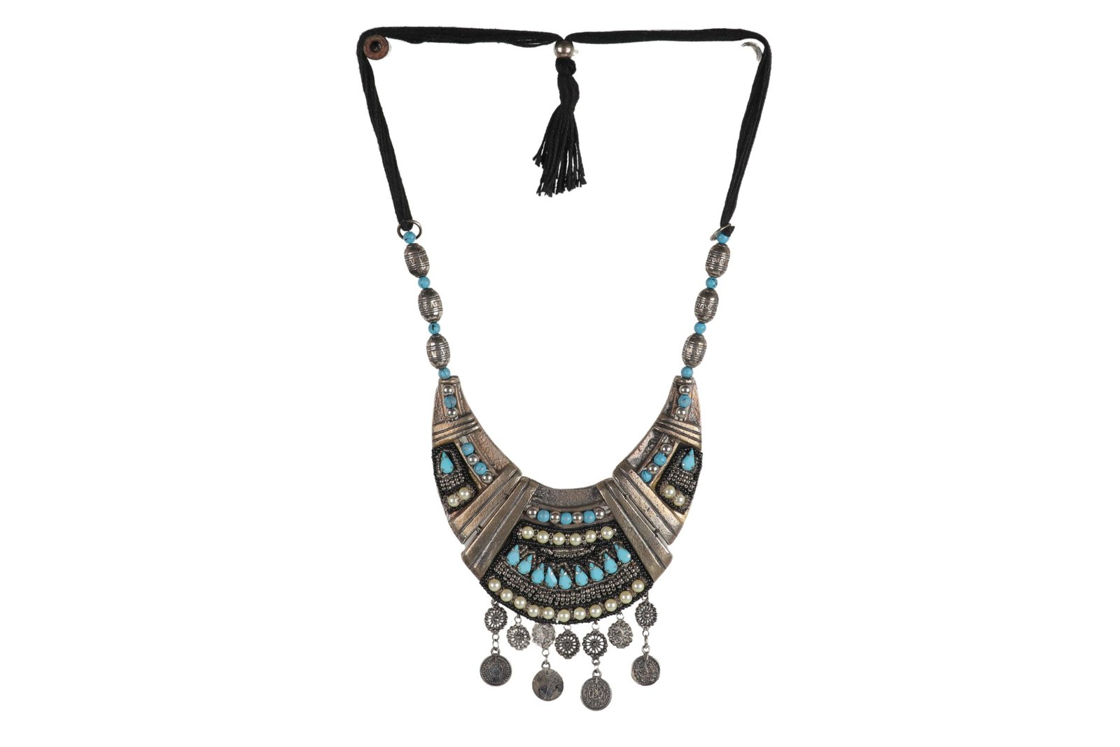 Step into the world of bohemian elegance with our Wanderlust Dream Necklace. This striking piece features a German silver finish, exuding a rustic charm that is both timeless and trendy. The crescent-shaped pendant is embellished with intricate patterns, turquoise beads, and shimmering accents, creating a vibrant mosaic that captures the essence of boho chic. Dangling coins add a touch of movement and whimsy, making this necklace a perfect accessory for festival outfits, casual wear, or adding a unique flair to any ensemble. Embrace the free spirit and artistic vibes with this beautiful statement piece.